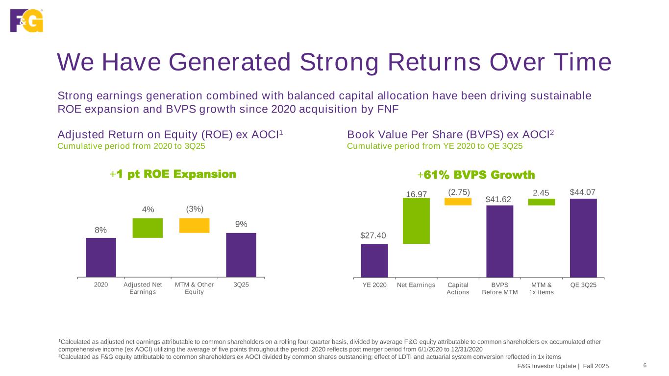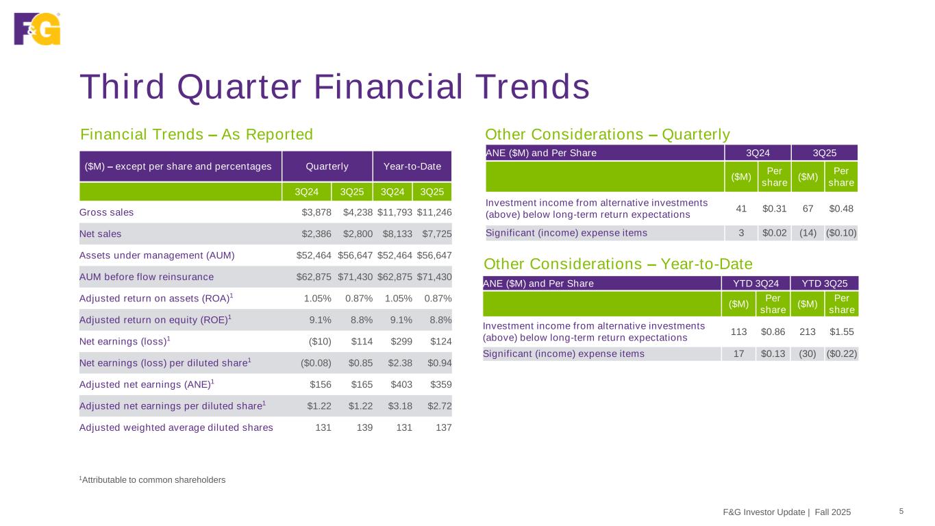 Third Quarter Financial Trends 5F&G Investor Update | Fall 2025 Other Considerations – Year-to-Date Other Considerations – Quarterly Financial Trends – As Reported ($M) – except per share and percentages Quarterly Year-to-Date 3Q24 3Q25 3Q24 3Q25 Gross sales $3,878 $4,238 $11,793 $11,246 Net sales $2,386 $2,800 $8,133 $7,725 Assets under management (AUM) $52,464 $56,647 $52,464 $56,647 AUM before flow reinsurance $62,875 $71,430 $62,875 $71,430 Adjusted return on assets (ROA)1 1.05% 0.87% 1.05% 0.87% Adjusted return on equity (ROE)1 9.1% 8.8% 9.1% 8.8% Net earnings (loss)1 ($10) $114 $299 $124 Net earnings (loss) per diluted share1 ($0.08) $0.85 $2.38 $0.94 Adjusted net earnings (ANE)1 $156 $165 $403 $359 Adjusted net earnings per diluted share1 $1.22 $1.22 $3.18 $2.72 Adjusted weighted average diluted shares 131 139 131 137 ANE ($M) and Per Share 3Q24 3Q25 ($M) Per share ($M) Per share Investment income from alternative investments (above) below long-term return expectations 41 $0.31 67 $0.48 Significant (income) expense items 3 $0.02 (14) ($0.10) ANE ($M) and Per Share YTD 3Q24 YTD 3Q25 ($M) Per share ($M) Per share Investment income from alternative investments (above) below long-term return expectations 113 $0.86 213 $1.55 Significant (income) expense items 17 $0.13 (30) ($0.22) 1Attributable to common shareholders