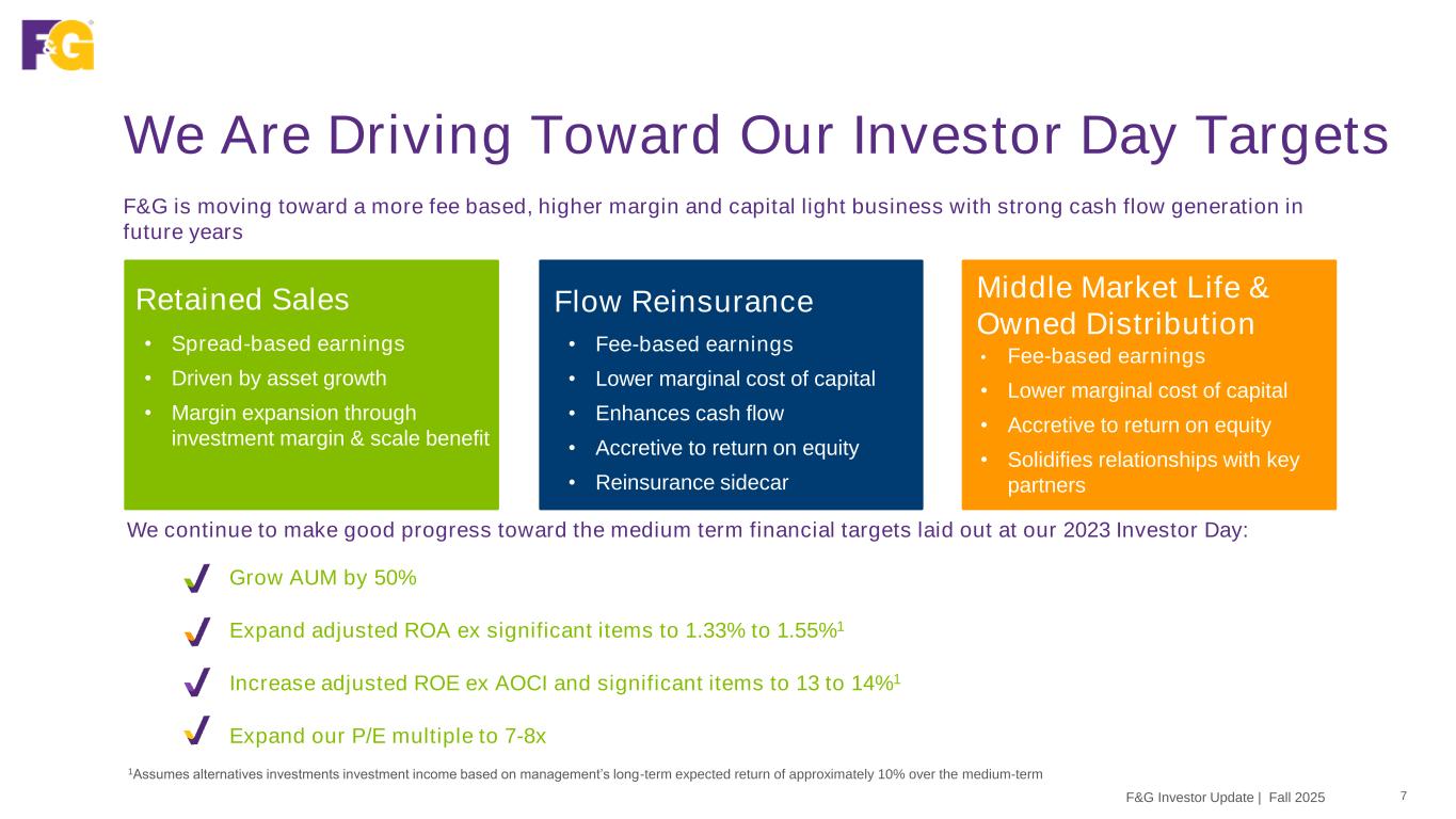 We Have Generated Strong Returns Over Time 6F&G Investor Update | Fall 2025 1Calculated as adjusted net earnings attributable to common shareholders on a rolling four quarter basis, divided by average F&G equity attributable to common shareholders ex accumulated other comprehensive income (ex AOCI) utilizing the average of five points throughout the period; 2020 reflects post merger period from 6/1/2020 to 12/31/2020 2Calculated as F&G equity attributable to common shareholders ex AOCI divided by common shares outstanding; effect of LDTI and actuarial system conversion reflected in 1x items Adjusted Return on Equity (ROE) ex AOCI1 Cumulative period from 2020 to 3Q25 Book Value Per Share (BVPS) ex AOCI2 Cumulative period from YE 2020 to QE 3Q25 8% 9% 4% (3%) 0% 2% 4% 6% 8% 10% 12% 14% 16% 18% 20% 2020 Adjusted Net Earnings MTM & Other Equity 3Q25 $27.40 $41.62 $44.07 16.97 (2.75) 2.45 YE 2020 Net Earnings Capital Actions BVPS Before MTM MTM & 1x Items QE 3Q25 Strong earnings generation combined with balanced capital allocation have been driving sustainable ROE expansion and BVPS growth since 2020 acquisition by FNF +1 pt ROE Expansion +61% BVPS Growth