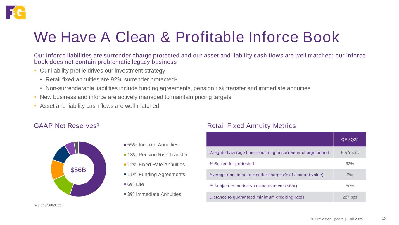 A Compelling Investment Case For F&G 9F&G Investor Update | Fall 2025 v Track Record of Success We have delivered consistent top line growth and return on assets across varying market cycles v Targeting Large and Growing Markets We have long-standing relationships with multiple distribution channels, an investment edge, and a track record of attracting top talent Superior Ecosystem F&G is a nationwide leader in the large markets we play in, and we expect demographic trends will provide tailwinds to give us significant room to continue growing – including untapped Middle Market demand for Life coverage and the opportunity to migrate consumers from CDs to fixed annuities Driving Margin Expansion and Improved Returns F&G is pursuing strategies to grow earnings, while generating significant positive net cash flow and diversifying into “capital light” flow reinsurance and accretive owned distribution to generate higher ROEs