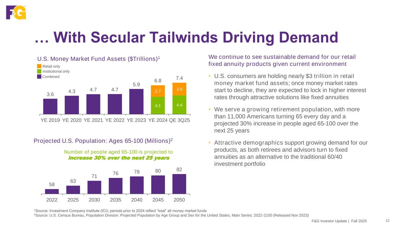 58 63 71 76 78 80 82 2022 2025 2030 2035 2040 2045 2050 … With Secular Tailwinds Driving Demand 12F&G Investor Update | Fall 2025 We continue to see sustainable demand for our retail fixed annuity products given current environment • U.S. consumers are holding nearly $3 trillion in retail money market fund assets; once money market rates start to decline, they are expected to lock in higher interest rates through attractive solutions like fixed annuities • We serve a growing retirement population, with more than 11,000 Americans turning 65 every day and a projected 30% increase in people aged 65-100 over the next 25 years • Attractive demographics support growing demand for our products, as both retirees and advisors turn to fixed annuities as an alternative to the traditional 60/40 investment portfolio 1Source: Investment Company Institute (ICI); periods prior to 2024 reflect “total” all money market funds 2Source: U.S. Census Bureau, Population Division; Projected Population by Age Group and Sex for the United States, Main Series: 2022-2100 (Released Nov 2023) U.S. Money Market Fund Assets ($Trillions)1 Projected U.S. Population: Ages 65-100 (Millions)2 Number of people aged 65-100 is projected to increase 30% over the next 25 years 4.1 4.4 2.7 3.0 3.6 4.3 4.7 4.7 5.9 6.8 7.4 YE 2019 YE 2020 YE 2021 YE 2022 YE 2023 YE 2024 QE 3Q25 Combined Institutional only Retail only