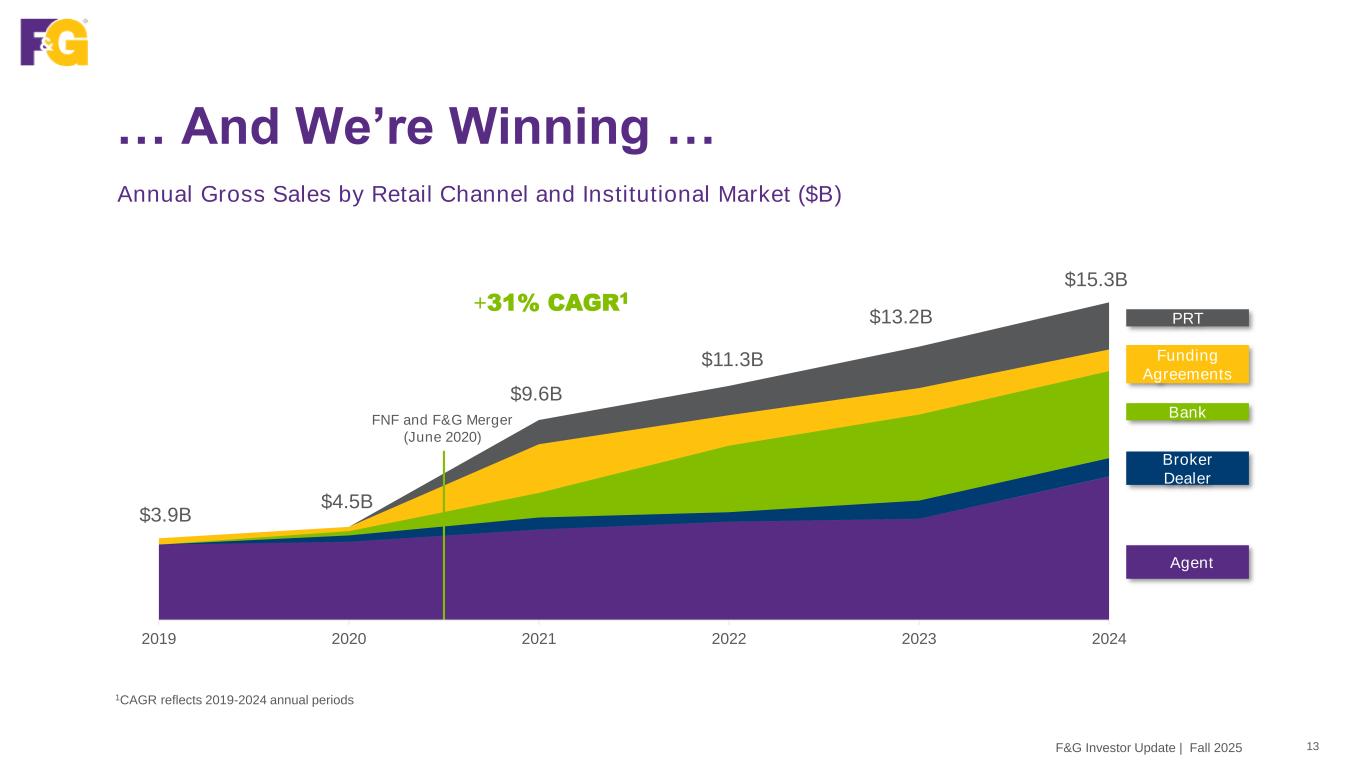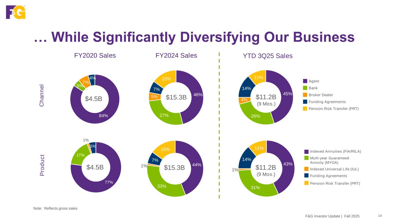 … And We’re Winning … 13F&G Investor Update | Fall 2025 1CAGR reflects 2019-2024 annual periods Annual Gross Sales by Retail Channel and Institutional Market ($B) 2019 2020 2021 2022 2023 2024 Funding Agreements Agent PRT Broker Dealer Bank $11.3B $9.6B $4.5B $3.9B FNF and F&G Merger (June 2020) $13.2B +31% CAGR1 $15.3B