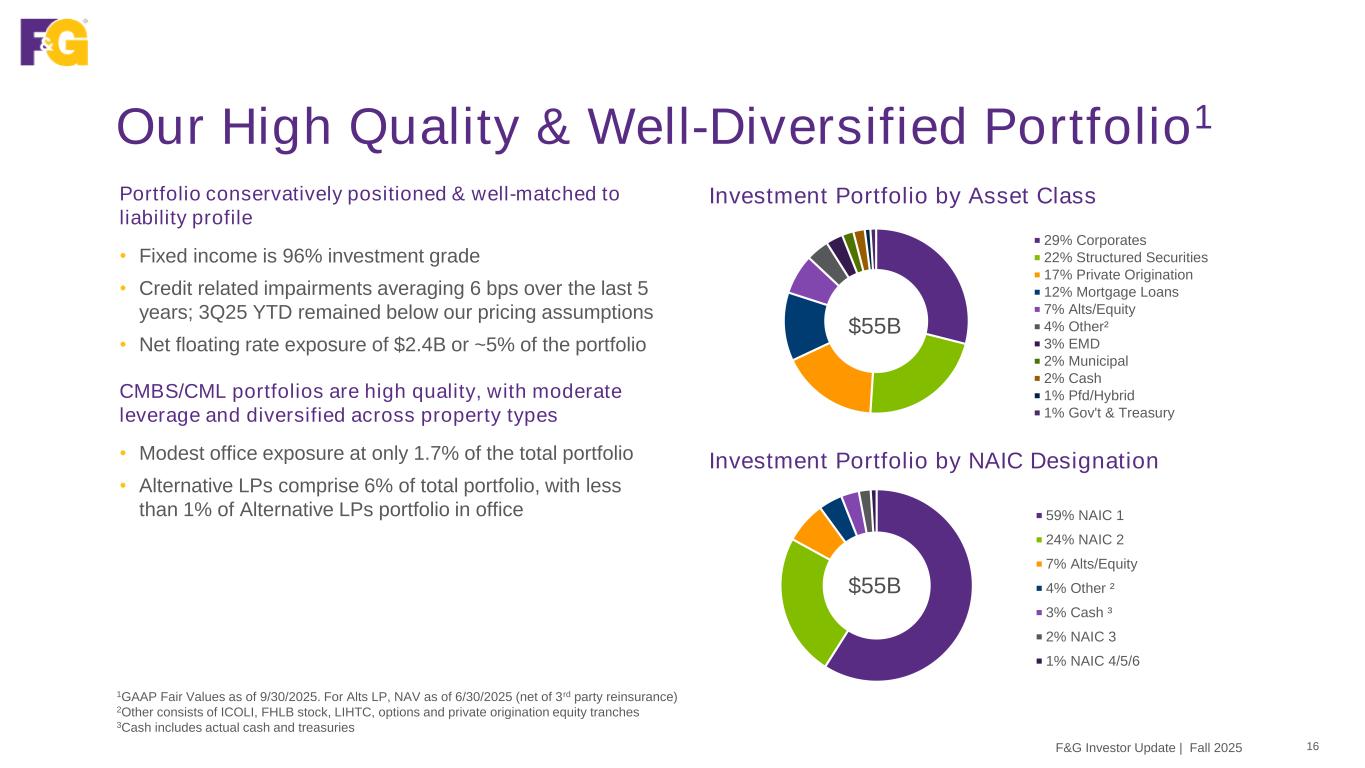 Our Owned Distribution Track Record 15F&G Investor Update | Fall 2025 Our owned distribution strategy is contributing to margin expansion and is a capital light, diversified source of fee-based earnings Portfolio is performing well and creating value • Owned distribution margin driven by seasonality, timing of dividends, mix of business & affiliated vs. unaffiliated sales • Owned distribution margin (ANE): $34M in 3Q25 YTD, including $13M in 3Q25 • Adjusted ROA contribution: 8 bps YTD 3Q25 (annualized) • GAAP reporting items to note: • Owned distribution margin reflects dividend income from minority-owned interests, plus percent share of margin for majority-owned interests • Affiliated revenue from F&G products sold by owned distribution is reflected in our product margin1, not the owned distribution margin Life Network Marketing IMO Traditional Annuity IMO “B2B” Annuity IMO Life Brokerage IMO ~$700M Cumulative investment 1Amount of affiliated revenue from F&G products sold by owned distribution and reflected in product margin (not the owned distribution margin): $8M in 2Q25 and $27M YTD 3Q25