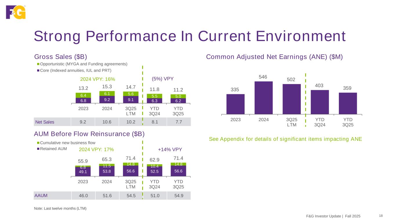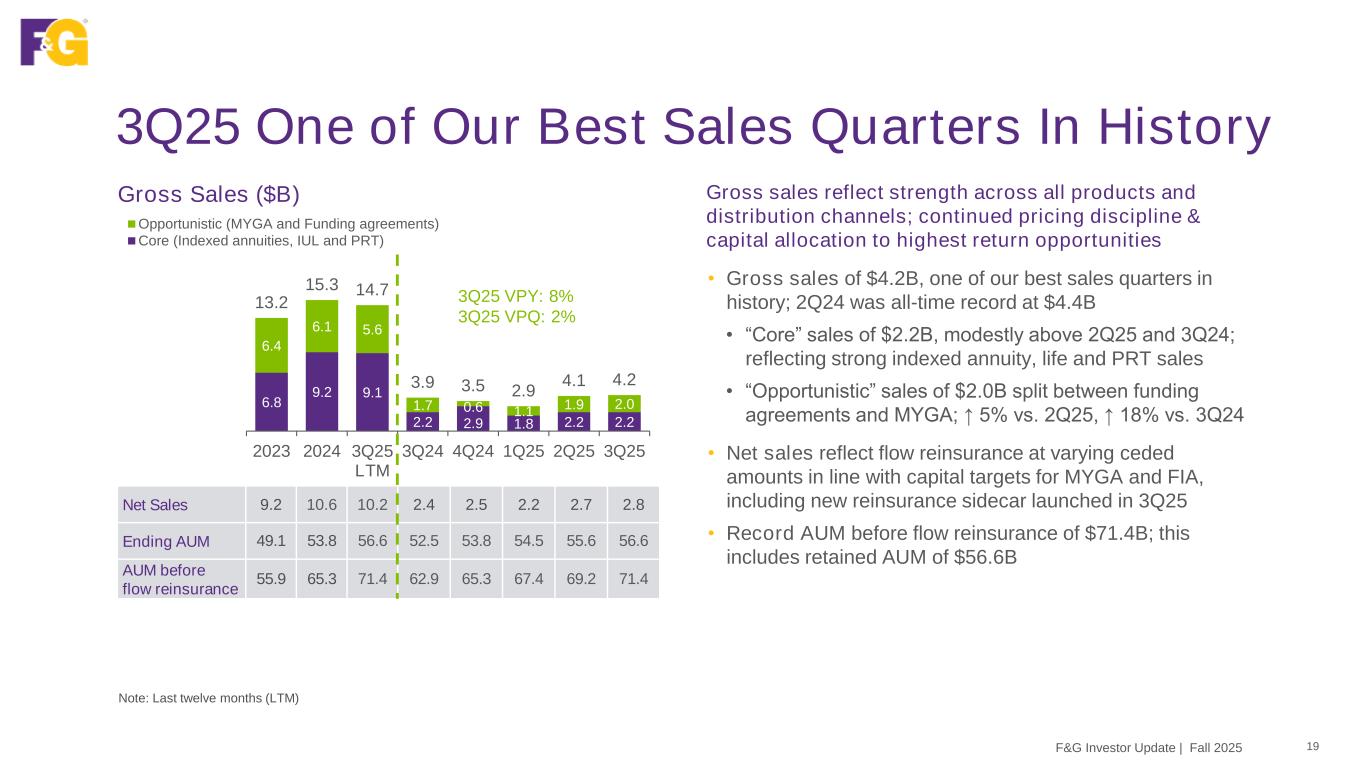 49.1 53.8 56.6 52.5 56.6 6.8 11.5 14.8 10.4 14.8 55.9 65.3 71.4 62.9 71.4 2023 2024 3Q25 LTM YTD 3Q24 YTD 3Q25 Cumulative new business flow Retained AUM 6.8 9.2 9.1 6.3 6.2 6.4 6.1 5.6 5.5 5.0 13.2 15.3 14.7 11.8 11.2 2023 2024 3Q25 LTM YTD 3Q24 YTD 3Q25 Opportunistic (MYGA and Funding agreements) Core (Indexed annuities, IUL and PRT) 335 546 502 403 359 2023 2024 3Q25 LTM YTD 3Q24 YTD 3Q25 Net Sales 9.2 10.6 10.2 8.1 7.7 Strong Performance In Current Environment Gross Sales ($B) AUM Before Flow Reinsurance ($B) Common Adjusted Net Earnings (ANE) ($M) F&G Investor Update | Fall 2025 18 2024 VPY: 17% AAUM 46.0 51.6 54.5 51.0 54.9 (5%) VPY2024 VPY: 16% Note: Last twelve months (LTM) +14% VPY See Appendix for details of significant items impacting ANE