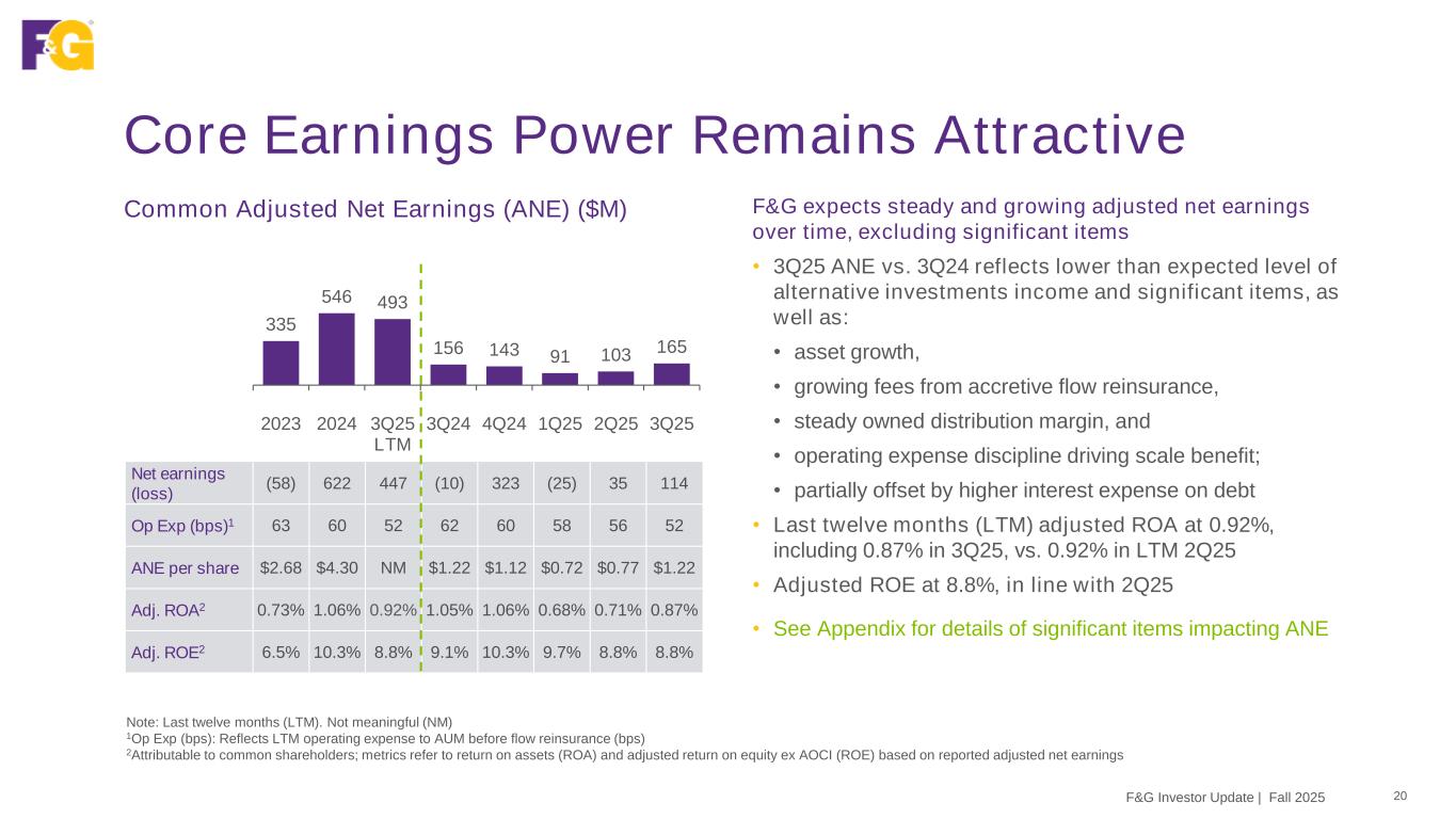 3Q25 One of Our Best Sales Quarters In History Gross Sales ($B) Gross sales reflect strength across all products and distribution channels; continued pricing discipline & capital allocation to highest return opportunities • Gross sales of $4.2B, one of our best sales quarters in history; 2Q24 was all-time record at $4.4B • “Core” sales of $2.2B, modestly above 2Q25 and 3Q24; reflecting strong indexed annuity, life and PRT sales • “Opportunistic” sales of $2.0B split between funding agreements and MYGA; ↑ 5% vs. 2Q25, ↑ 18% vs. 3Q24 • Net sales reflect flow reinsurance at varying ceded amounts in line with capital targets for MYGA and FIA, including new reinsurance sidecar launched in 3Q25 • Record AUM before flow reinsurance of $71.4B; this includes retained AUM of $56.6B F&G Investor Update | Fall 2025 19 Note: Last twelve months (LTM) Net Sales 9.2 10.6 10.2 2.4 2.5 2.2 2.7 2.8 Ending AUM 49.1 53.8 56.6 52.5 53.8 54.5 55.6 56.6 AUM before flow reinsurance 55.9 65.3 71.4 62.9 65.3 67.4 69.2 71.4 6.8 9.2 9.1 2.2 2.9 1.8 2.2 2.2 6.4 6.1 5.6 1.7 0.6 1.1 1.9 2.0 13.2 15.3 14.7 3.9 3.5 2.9 4.1 4.2 2023 2024 3Q25 LTM 3Q24 4Q24 1Q25 2Q25 3Q25 Opportunistic (MYGA and Funding agreements) Core (Indexed annuities, IUL and PRT) 3Q25 VPY: 8% 3Q25 VPQ: 2%
