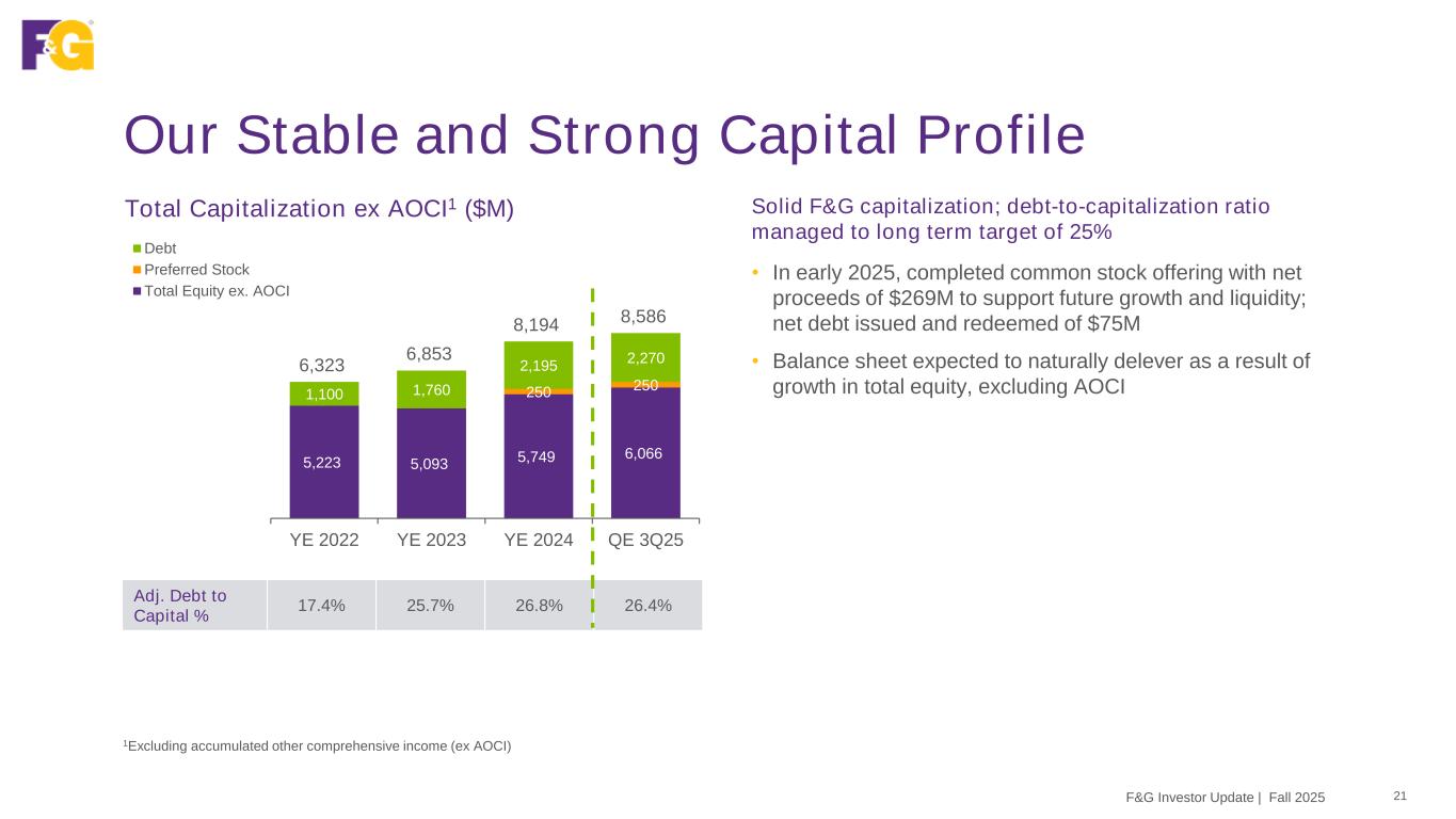 335 546 493 156 143 91 103 165 2023 2024 3Q25 LTM 3Q24 4Q24 1Q25 2Q25 3Q25 Net earnings (loss) (58) 622 447 (10) 323 (25) 35 114 Op Exp (bps)1 63 60 52 62 60 58 56 52 ANE per share $2.68 $4.30 NM $1.22 $1.12 $0.72 $0.77 $1.22 Adj. ROA2 0.73% 1.06% 0.92% 1.05% 1.06% 0.68% 0.71% 0.87% Adj. ROE2 6.5% 10.3% 8.8% 9.1% 10.3% 9.7% 8.8% 8.8% Core Earnings Power Remains Attractive 20F&G Investor Update | Fall 2025 Common Adjusted Net Earnings (ANE) ($M) Note: Last twelve months (LTM). Not meaningful (NM) 1Op Exp (bps): Reflects LTM operating expense to AUM before flow reinsurance (bps) 2Attributable to common shareholders; metrics refer to return on assets (ROA) and adjusted return on equity ex AOCI (ROE) based on reported adjusted net earnings F&G expects steady and growing adjusted net earnings over time, excluding significant items • 3Q25 ANE vs. 3Q24 reflects lower than expected level of alternative investments income and significant items, as well as: • asset growth, • growing fees from accretive flow reinsurance, • steady owned distribution margin, and • operating expense discipline driving scale benefit; • partially offset by higher interest expense on debt • Last twelve months (LTM) adjusted ROA at 0.92%, including 0.87% in 3Q25, vs. 0.92% in LTM 2Q25 • Adjusted ROE at 8.8%, in line with 2Q25 • See Appendix for details of significant items impacting ANE