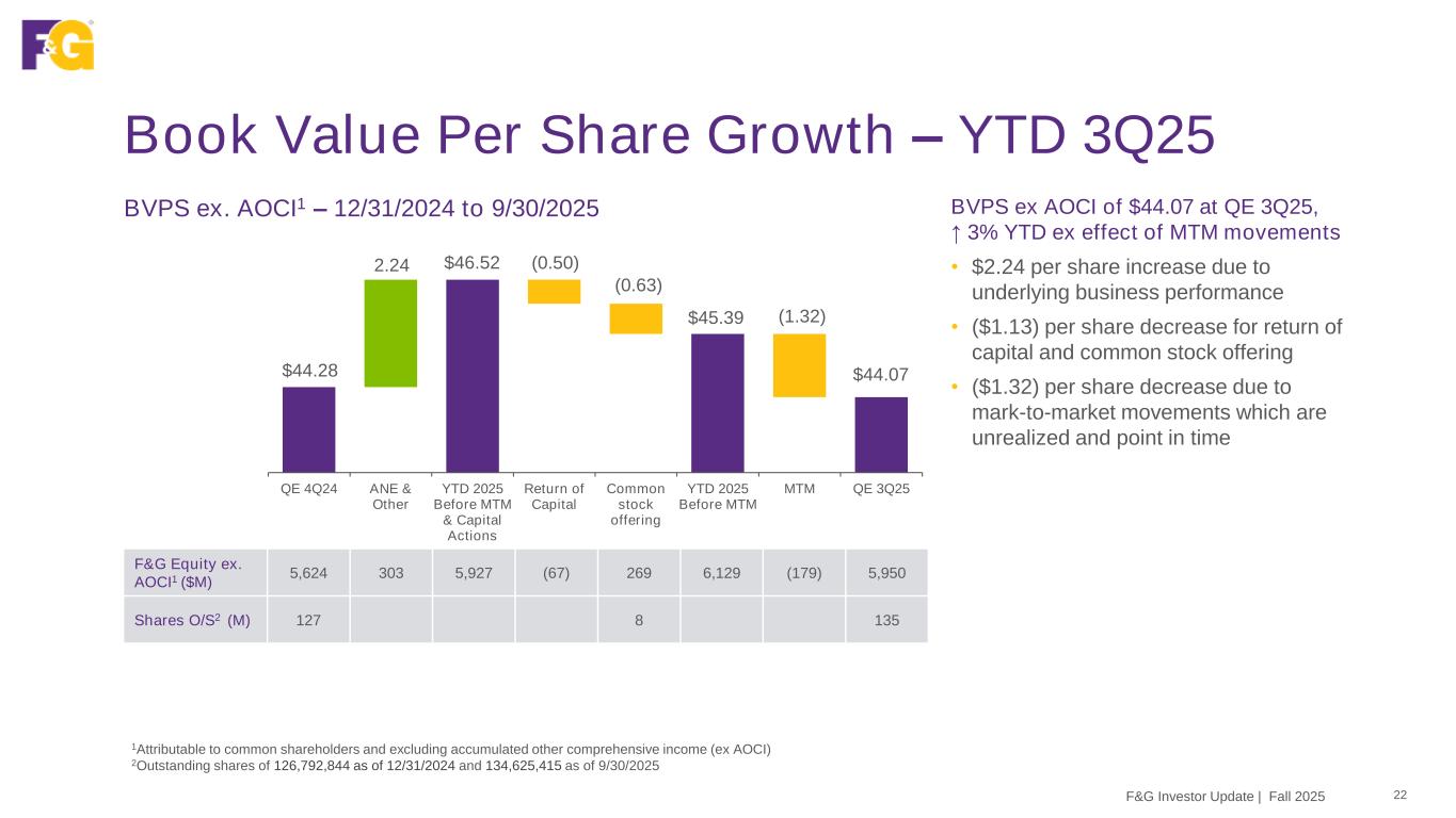 Our Stable and Strong Capital Profile 21F&G Investor Update | Fall 2025 1Excluding accumulated other comprehensive income (ex AOCI) Total Capitalization ex AOCI1 ($M) 5,223 5,093 5,749 6,066 250 250 1,100 1,760 2,195 2,270 6,323 6,853 8,194 8,586 YE 2022 YE 2023 YE 2024 QE 3Q25 Debt Preferred Stock Total Equity ex. AOCI Adj. Debt to Capital % 17.4% 25.7% 26.8% 26.4% Solid F&G capitalization; debt-to-capitalization ratio managed to long term target of 25% • In early 2025, completed common stock offering with net proceeds of $269M to support future growth and liquidity; net debt issued and redeemed of $75M • Balance sheet expected to naturally delever as a result of growth in total equity, excluding AOCI