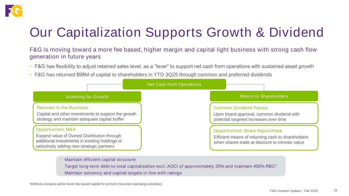 F&G Investor Update | Fall 2025 Book Value Per Share Growth – YTD 3Q25 22 BVPS ex. AOCI1 – 12/31/2024 to 9/30/2025 $44.28 $46.52 $45.39 $44.07 2.24 (0.50) (0.63) (1.32) $42.50 $43.00 $43.50 $44.00 $44.50 $45.00 $45.50 $46.00 $46.50 $47.00 QE 4Q24 ANE & Other YTD 2025 Before MTM & Capital Actions Return of Capital Common stock offering YTD 2025 Before MTM MTM QE 3Q25 F&G Equity ex. AOCI1 ($M) 5,624 303 5,927 (67) 269 6,129 (179) 5,950 Shares O/S2 (M) 127 8 135 1Attributable to common shareholders and excluding accumulated other comprehensive income (ex AOCI) 2Outstanding shares of 126,792,844 as of 12/31/2024 and 134,625,415 as of 9/30/2025 BVPS ex AOCI of $44.07 at QE 3Q25, ↑ 3% YTD ex effect of MTM movements • $2.24 per share increase due to underlying business performance • ($1.13) per share decrease for return of capital and common stock offering • ($1.32) per share decrease due to mark-to-market movements which are unrealized and point in time