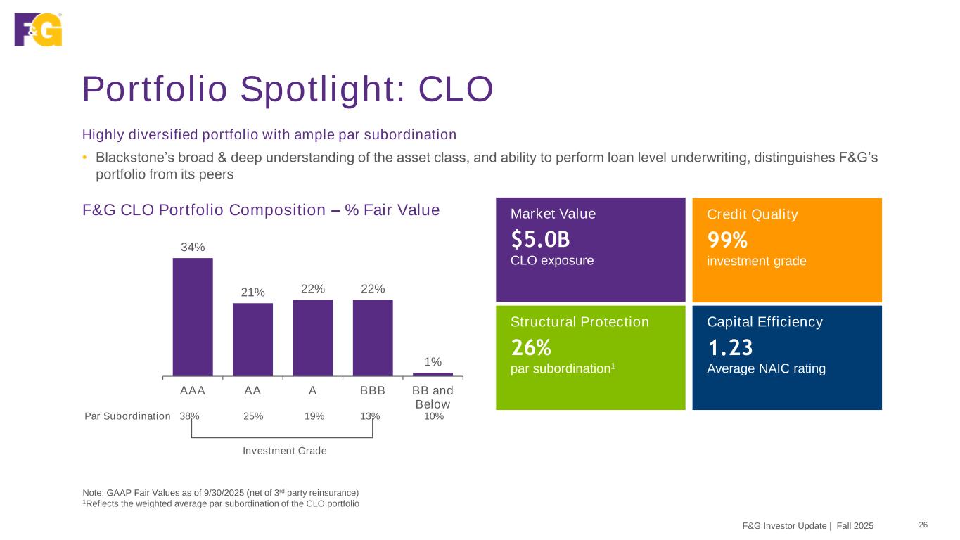 10% Net Asset Value Lending 8% Communication Infrastructure 7% Residential Solar 7% Liquified Natural Gas 7% Lender Finance 6% Manufactured Housing 6% Home Improvement 5% Aviation 5% Data Centers 5% Whole Business 34% All Other (< Top 10) Overview of Structured Credit 25 Investment Rationale • Collateralized loan obligation (CLO) portfolio well diversified across industry, issuer and manager; focus on investment grade with ample par subordination • Commercial mortgage-backed securities (CMBS) focus on seasoned CMBS which allows for visibility into credit performance, built-in appreciation and contractual amortization which reduces risk exposure; target more stable property types, such as multi-family, to create a defensive portfolio • Asset Backed Securities (ABS) focus on high quality, directly originated specialty finance assets diversified by collateral type CMBS by Property Type CLO Top 10 Industries ABS Top 10 Collateral Type Note: GAAP Fair Values as of 9/30/2025 (net of 3rd party reinsurance) 12% High Tech 11% Healthcare & Pharmaceuticals 10% Banking, Finance, Insurance & Real Estate 8% Services: Business 5% Hotels, Gaming & Leisure 4% Construction & Building 4% Capital Equipment 3% Chemicals, Plastics & Rubber 3% Aerospace & Defense 3% Beverage, Food & Tobacco 37% Other (< Top 10) $5B $6B $4B 39% Multifamily 16% Industrial 16% Office 8% Hotel 5% Retail 2% US Treasury 2% Mixed Use 1% Special Purpose 1% Self-Storage 1% Manufactured Housing 9% Other (< Top 10) F&G Investor Update | Fall 2025