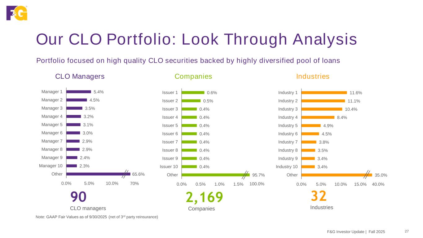 Portfolio Spotlight: CLO 26 Highly diversified portfolio with ample par subordination • Blackstone’s broad & deep understanding of the asset class, and ability to perform loan level underwriting, distinguishes F&G’s portfolio from its peers F&G CLO Portfolio Composition – % Fair Value Note: GAAP Fair Values as of 9/30/2025 (net of 3rd party reinsurance) 1Reflects the weighted average par subordination of the CLO portfolio Investment Grade Credit Quality 99% investment grade Structural Protection 26% par subordination1 Capital Efficiency 1.23 Average NAIC rating Market Value $5.0B CLO exposure F&G Investor Update | Fall 2025 34% 21% 22% 22% 1% AAA AA A BBB BB and Below Par Subordination 38% 25% 19% 13% 10%