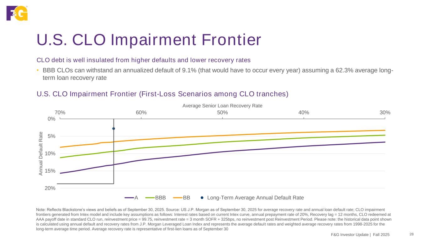 Our CLO Portfolio: Look Through Analysis 27 Portfolio focused on high quality CLO securities backed by highly diversified pool of loans Note: GAAP Fair Values as of 9/30/2025 (net of 3rd party reinsurance) IndustriesCompaniesCLO Managers 90 CLO managers 2,169 Companies 32 Industries 5.4% 4.5% 3.5% 3.2% 3.1% 3.0% 2.9% 2.9% 2.4% 2.3% 65.6% 0.0% 5.0% 10.0% 15.0% Manager 1 Manager 2 Manager 3 Manager 4 Manager 5 Manager 6 Manager 7 Manager 8 Manager 9 Manager 10 Other 70% 0.6% 0.5% 0.4% 0.4% 0.4% 0.4% 0.4% 0.4% 0.4% 0.4% 95.7% 0.0% 0.5% 1.0% 1.5% 2.0% Issuer 1 Issuer 2 Issuer 3 Issuer 4 Issuer 5 Issuer 6 Issuer 7 Issuer 8 Issuer 9 Issuer 10 Other 100.0% 11.6% 11.1% 10.4% 8.4% 4.9% 4.5% 3.8% 3.5% 3.4% 3.4% 35.0% 0.0% 5.0% 10.0% 15.0% 20.0% Industry 1 Industry 2 Industry 3 Industry 4 Industry 5 Industry 6 Industry 7 Industry 8 Industry 9 Industry 10 Other 40.0% F&G Investor Update | Fall 2025