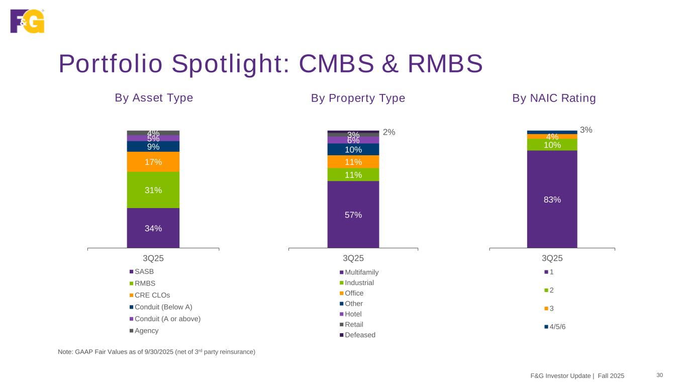 Portfolio Spotlight: Real Estate Debt 29 Blackstone Real Estate Debt Strategies (BREDS) has assembled a high-quality portfolio with diversified exposure across asset classes and properties Note: GAAP Fair Values as of 9/30/2025 (net of 3rd party reinsurance) 32% CML 31% CMBS 17% RMBS 14% RML 6% Other $13B Duration 3.7 years Quality 1.3 Average NAIC rating Market Value $13.0B Real estate portfolio Weighted Average Life 5.5 years F&G Investor Update | Fall 2025