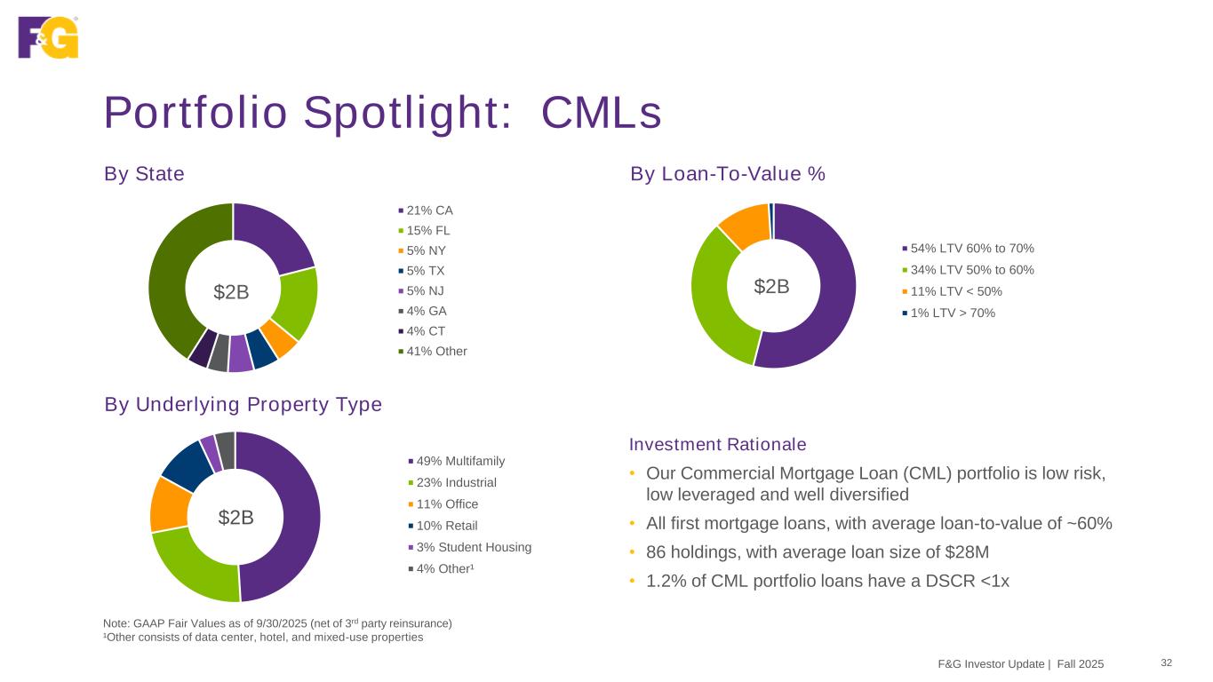 Portfolio Spotlight: CMBS 31 Prudent asset selection has led to more multifamily exposure and less retail vs. Conduit CMBS market averages Portfolio Construction Comparison1 Note: GAAP Fair Values as of 9/30/2025 (net of 3rd party reinsurance) 1BAML Conduit Data as of 10/1/2025 39% 5% 14% 24% Multifamily Retail F&G Post-Crisis Conduit CMBS Credit Quality 87% Investment grade (NRSRO) Quality 1.4 Average NAIC rating Market Value $4.1B CMBS portfolio Credit focus A- NRSRO rating F&G Investor Update | Fall 2025