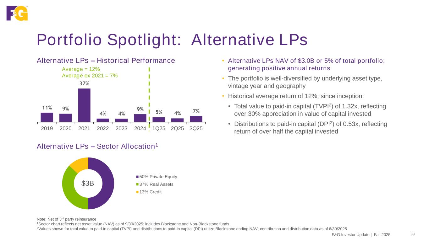50% Private Equity 37% Real Assets 13% Credit $3B Portfolio Spotlight: Alternative LPs 33F&G Investor Update | Fall 2025 • Alternative LPs NAV of $3.0B or 5% of total portfolio; generating positive annual returns • The portfolio is well-diversified by underlying asset type, vintage year and geography • Historical average return of 12%; since inception: • Total value to paid-in capital (TVPI2) of 1.32x, reflecting over 30% appreciation in value of capital invested • Distributions to paid-in capital (DPI2) of 0.53x, reflecting return of over half the capital invested Note: Net of 3rd party reinsurance 1Sector chart reflects net asset value (NAV) as of 9/30/2025; includes Blackstone and Non-Blackstone funds 2Values shown for total value to paid-in capital (TVPI) and distributions to paid-in capital (DPI) utilize Blackstone ending NAV, contribution and distribution data as of 6/30/2025 Alternative LPs – Historical Performance 11% 9% 37% 4% 4% 9% 5% 4% 7% 2019 2020 2021 2022 2023 2024 1Q25 2Q25 3Q25 Average = 12% Average ex 2021 = 7% Alternative LPs – Sector Allocation1