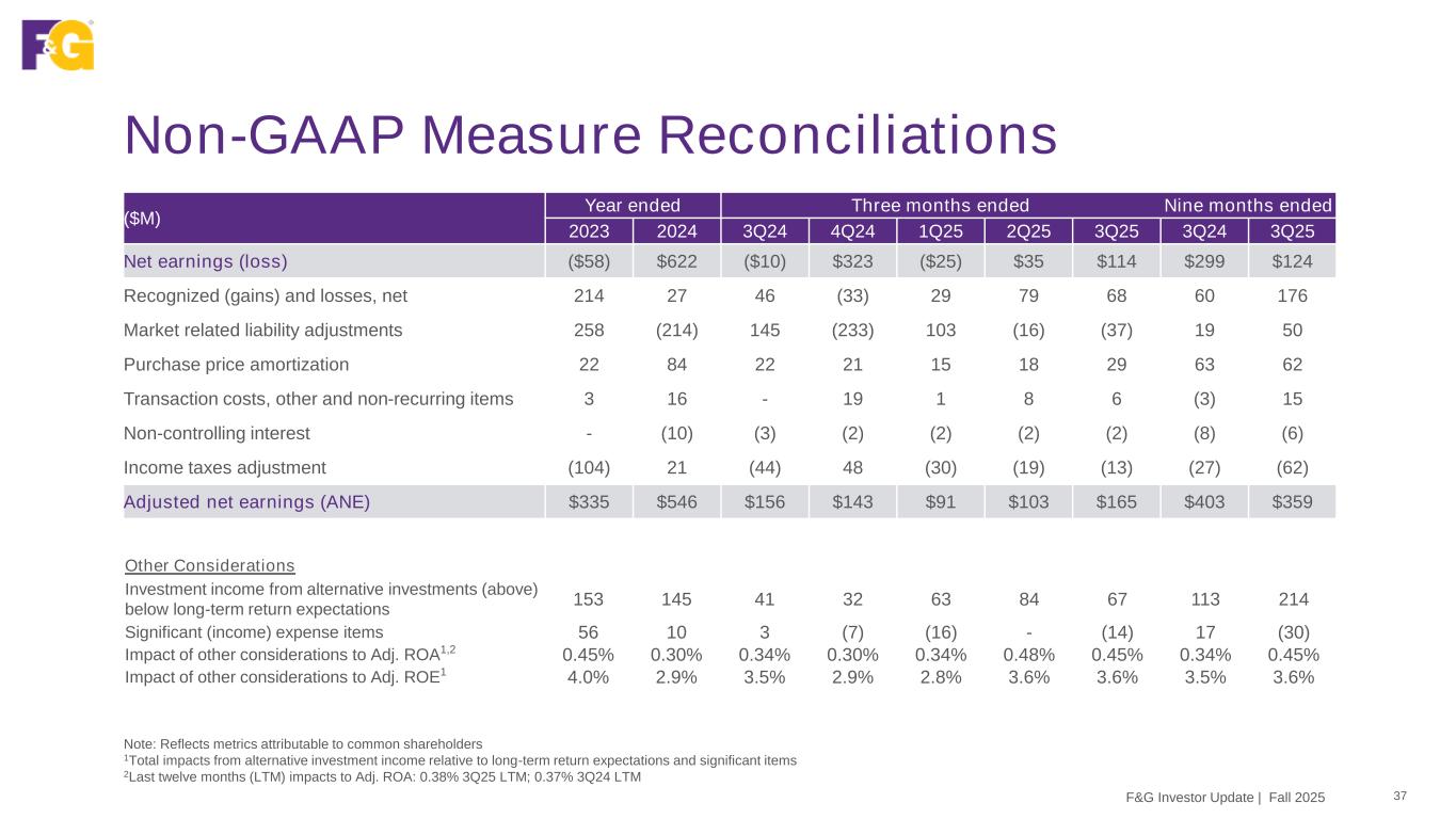 Non-GAAP Measure Reconciliations 37F&G Investor Update | Fall 2025 Note: Reflects metrics attributable to common shareholders 1Total impacts from alternative investment income relative to long-term return expectations and significant items 2Last twelve months (LTM) impacts to Adj. ROA: 0.38% 3Q25 LTM; 0.37% 3Q24 LTM ($M) Year ended Three months ended Nine months ended 2023 2024 3Q24 4Q24 1Q25 2Q25 3Q25 3Q24 3Q25 Net earnings (loss) ($58) $622 ($10) $323 ($25) $35 $114 $299 $124 Recognized (gains) and losses, net 214 27 46 (33) 29 79 68 60 176 Market related liability adjustments 258 (214) 145 (233) 103 (16) (37) 19 50 Purchase price amortization 22 84 22 21 15 18 29 63 62 Transaction costs, other and non-recurring items 3 16 - 19 1 8 6 (3) 15 Non-controlling interest - (10) (3) (2) (2) (2) (2) (8) (6) Income taxes adjustment (104) 21 (44) 48 (30) (19) (13) (27) (62) Adjusted net earnings (ANE) $335 $546 $156 $143 $91 $103 $165 $403 $359 Other Considerations Investment income from alternative investments (above) below long-term return expectations 153 145 41 32 63 84 67 113 214 Significant (income) expense items 56 10 3 (7) (16) - (14) 17 (30) Impact of other considerations to Adj. ROA1,2 0.45% 0.30% 0.34% 0.30% 0.34% 0.48% 0.45% 0.34% 0.45% Impact of other considerations to Adj. ROE1 4.0% 2.9% 3.5% 2.9% 2.8% 3.6% 3.6% 3.5% 3.6%