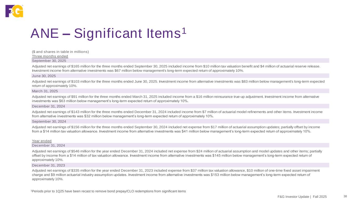 ANE – Significant Items1 38F&G Investor Update | Fall 2025 1Periods prior to 1Q25 have been recast to remove bond prepay/CLO redemptions from significant items ($ and shares in table in millions) Three months ended September 30, 2025 Adjusted net earnings of $165 million for the three months ended September 30, 2025 included income from $10 million tax valuation benefit and $4 million of actuarial reserve release. Investment income from alternative investments was $67 million below management's long-term expected return of approximately 10%. June 30, 2025 Adjusted net earnings of $103 million for the three months ended June 30, 2025. Investment income from alternative investments was $83 million below management's long-term expected return of approximately 10%. March 31, 2025 Adjusted net earnings of $91 million for the three months ended March 31, 2025 included income from a $16 million reinsurance true-up adjustment. Investment income from alternative investments was $63 million below management’s long-term expected return of approximately 10%. December 31, 2024 Adjusted net earnings of $143 million for the three months ended December 31, 2024 included income from $7 million of actuarial model refinements and other items. Investment income from alternative investments was $32 million below management’s long-term expected return of approximately 10%. September 30, 2024 Adjusted net earnings of $156 million for the three months ended September 30, 2024 included net expense from $17 million of actuarial assumption updates; partially offset by income from a $14 million tax valuation allowance. Investment income from alternative investments was $41 million below management’s long-term expected return of approximately 10%. Year ended December 31, 2024 Adjusted net earnings of $546 million for the year ended December 31, 2024 included net expense from $24 million of actuarial assumption and model updates and other items; partially offset by income from a $14 million of tax valuation allowance. Investment income from alternative investments was $145 million below management’s long-term expected return of approximately 10%. December 31, 2023 Adjusted net earnings of $335 million for the year ended December 31, 2023 included expense from $37 million tax valuation allowance, $10 million of one-time fixed asset impairment charge and $9 million actuarial industry assumption updates. Investment income from alternative investments was $153 million below management’s long-term expected return of approximately 10%.