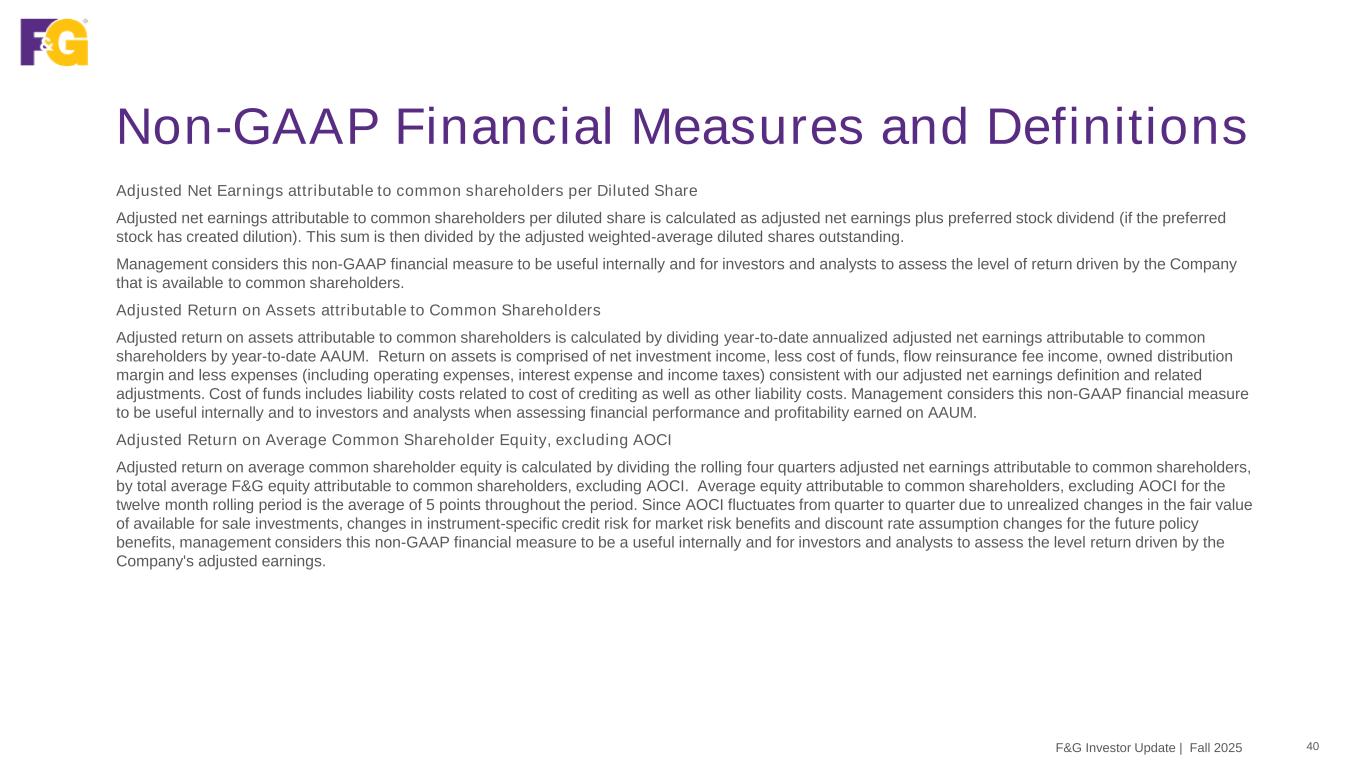 Non-GAAP Financial Measures and Definitions 39F&G Investor Update | Fall 2025 The following represents the definitions of non-GAAP financial measures used by F&G Adjusted Net Earnings attributable to common shareholders Adjusted net earnings attributable to common shareholders is a non-GAAP economic measure we use to evaluate financial performance each period. Adjusted net earnings attributable to common shareholders is calculated by adjusting net earnings (loss) attributable to common shareholders to eliminate: (i) Recognized (gains) and losses, net: the impact of net investment gains/losses, including changes in allowance for expected credit losses and other than temporary impairment (“OTTI”) losses, recognized in operations; and the effects of changes in fair value of the reinsurance related embedded derivative and other derivatives, including interest rate swaps and forwards; (ii) Market related liability adjustments: the impacts related to changes in the fair value, including both realized and unrealized gains and losses, of index product related derivatives and embedded derivatives, net of hedging cost; the impact of initial pension risk transfer deferred profit liability losses, including amortization from previously deferred pension risk transfer deferred profit liability losses; and the changes in the fair value of market risk benefits by deferring current period changes and amortizing that amount over the life of the market risk benefit; (iii) Purchase price amortization: the impacts related to the amortization of certain intangibles (internally developed software, trademarks and value of distribution asset and the change in fair value of liabilities recognized as a result of acquisition activities); (iv) Transaction costs: the impacts related to acquisition, integration and merger related items; (v) Other and “non-recurring,” “infrequent” or “unusual items”: Other adjustments include removing any charges associated with U.S. guaranty fund assessments as these charges neither relate to the ordinary course of the Company’s business nor reflect the Company’s underlying business performance, but result from external situations not controlled by the Company. Further, Management excludes certain items determined to be “non-recurring,” “infrequent” or “unusual” from adjusted net earnings when incurred if it is determined these expenses are not a reflection of the core business and when the nature of the item is such that it is not reasonably likely to recur within two years and/or there was not a similar item in the preceding two years; (vi) Non-controlling interest on non-GAAP adjustments: the portion of the non-GAAP adjustments attributable to the equity interest of entities that F&G does not wholly own; and (vii) Income taxes: the income tax impact related to the above-mentioned adjustments is measured using an effective tax rate, as appropriate by tax jurisdiction. While these adjustments are an integral part of the overall performance of F&G, market conditions and/or the non-operating nature of these items can overshadow the underlying performance of the core business. Accordingly, management considers this to be a useful measure internally and to investors and analysts in analyzing the trends of our operations. Adjusted net earnings should not be used as a substitute for net earnings (loss). However, we believe the adjustments made to net earnings (loss) in order to derive adjusted net earnings provide an understanding of our overall results of operations.