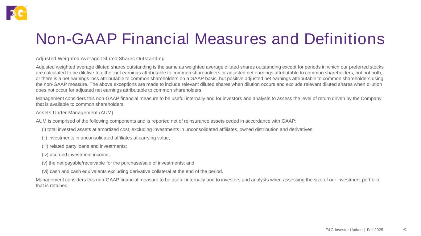 Non-GAAP Financial Measures and Definitions 40F&G Investor Update | Fall 2025 Adjusted Net Earnings attributable to common shareholders per Diluted Share Adjusted net earnings attributable to common shareholders per diluted share is calculated as adjusted net earnings plus preferred stock dividend (if the preferred stock has created dilution). This sum is then divided by the adjusted weighted-average diluted shares outstanding. Management considers this non-GAAP financial measure to be useful internally and for investors and analysts to assess the level of return driven by the Company that is available to common shareholders. Adjusted Return on Assets attributable to Common Shareholders Adjusted return on assets attributable to common shareholders is calculated by dividing year-to-date annualized adjusted net earnings attributable to common shareholders by year-to-date AAUM. Return on assets is comprised of net investment income, less cost of funds, flow reinsurance fee income, owned distribution margin and less expenses (including operating expenses, interest expense and income taxes) consistent with our adjusted net earnings definition and related adjustments. Cost of funds includes liability costs related to cost of crediting as well as other liability costs. Management considers this non-GAAP financial measure to be useful internally and to investors and analysts when assessing financial performance and profitability earned on AAUM. Adjusted Return on Average Common Shareholder Equity, excluding AOCI Adjusted return on average common shareholder equity is calculated by dividing the rolling four quarters adjusted net earnings attributable to common shareholders, by total average F&G equity attributable to common shareholders, excluding AOCI. Average equity attributable to common shareholders, excluding AOCI for the twelve month rolling period is the average of 5 points throughout the period. Since AOCI fluctuates from quarter to quarter due to unrealized changes in the fair value of available for sale investments, changes in instrument-specific credit risk for market risk benefits and discount rate assumption changes for the future policy benefits, management considers this non-GAAP financial measure to be a useful internally and for investors and analysts to assess the level return driven by the Company's adjusted earnings.