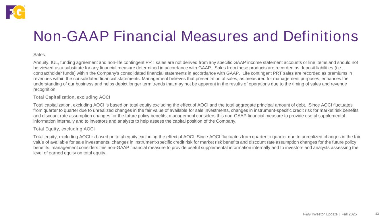 Non-GAAP Financial Measures and Definitions 42F&G Investor Update | Fall 2025 AUM before Flow Reinsurance AUM before Flow Reinsurance is comprised of AUM plus flow reinsured assets, including certain block reinsured assets that have the characteristics of flow reinsured assets. Management considers this non-GAAP financial measure to be useful internally and to investors and analysts when assessing the size of our investment portfolio including reinsured assets. Average Assets Under Management (AAUM) (Quarterly and YTD) AAUM is calculated as AUM at the beginning of the period and the end of each month in the period, divided by the total number of months in the period plus one. Management considers this non-GAAP financial measure to be useful internally and to investors and analysts when assessing the rate of return on retained assets. Book Value per Common Share, excluding AOCI Book value per Common share, excluding AOCI is calculated as total F&G equity attributable to common shareholders divided by the total number of shares of common stock outstanding. Management considers this to be a useful measure internally and for investors and analysts to assess the capital position of the Company. Debt-to-Capital Ratio, excluding AOCI Debt-to-capitalization ratio is computed by dividing total aggregate principal amount of debt by total capitalization (total debt plus total equity, excluding AOCI). Management considers this non-GAAP financial measure to be useful internally and to investors and analysts when assessing its capital position. Return on Average F&G common shareholder Equity, excluding AOCI Return on average F&G common shareholder equity, excluding AOCI is calculated by dividing the rolling four quarters net earnings (loss) attributable to common shareholders, by total average F&G equity attributable to common shareholders, excluding AOCI. Average F&G equity attributable to common shareholders, excluding AOCI for the twelve month rolling period is the average of 5 points throughout the period. Since AOCI fluctuates from quarter to quarter due to unrealized changes in the fair value of available for sale investments, changes in instrument-specific credit risk for market risk benefits and discount rate assumption changes for the future policy benefits, management considers this non-GAAP financial measure to be useful internally and for investors and analysts to assess the level of return driven by the Company that is available to common shareholders.