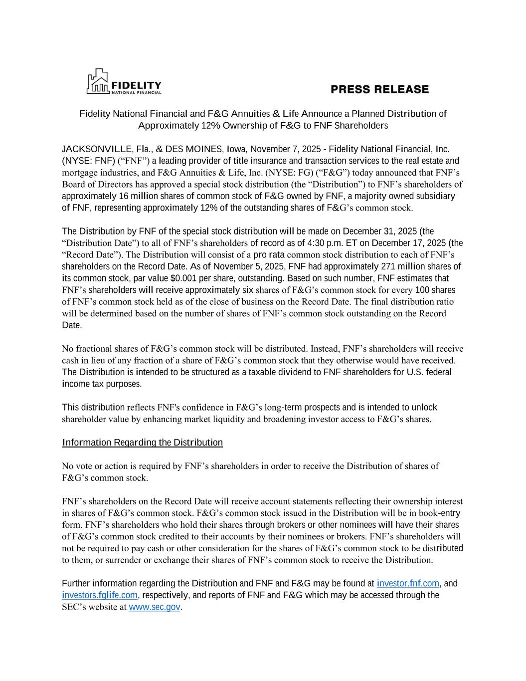 Fidelity National Financial and F&G Annuities & Life Announce a Planned Distribution of Approximately 12% Ownership of F&G to FNF Shareholders JACKSONVILLE, Fla., & DES MOINES, Iowa, November 7, 2025 - Fidelity National Financial, Inc. (NYSE: FNF) (“FNF”) a leading provider of title insurance and transaction services to the real estate and mortgage industries, and F&G Annuities & Life, Inc. (NYSE: FG) (“F&G”) today announced that FNF’s Board of Directors has approved a special stock distribution (the “Distribution”) to FNF’s shareholders of approximately 16 million shares of common stock of F&G owned by FNF, a majority owned subsidiary of FNF, representing approximately 12% of the outstanding shares of F&G’s common stock. The Distribution by FNF of the special stock distribution will be made on December 31, 2025 (the “Distribution Date”) to all of FNF’s shareholders of record as of 4:30 p.m. ET on December 17, 2025 (the “Record Date”). The Distribution will consist of a pro rata common stock distribution to each of FNF’s shareholders on the Record Date. As of November 5, 2025, FNF had approximately 271 million shares of its common stock, par value $0.001 per share, outstanding. Based on such number, FNF estimates that FNF’s shareholders will receive approximately six shares of F&G’s common stock for every 100 shares of FNF’s common stock held as of the close of business on the Record Date. The final distribution ratio will be determined based on the number of shares of FNF’s common stock outstanding on the Record Date. No fractional shares of F&G’s common stock will be distributed. Instead, FNF’s shareholders will receive cash in lieu of any fraction of a share of F&G’s common stock that they otherwise would have received. The Distribution is intended to be structured as a taxable dividend to FNF shareholders for U.S. federal income tax purposes. This distribution reflects FNF's confidence in F&G’s long-term prospects and is intended to unlock shareholder value by enhancing market liquidity and broadening investor access to F&G’s shares. Information Regarding the Distribution No vote or action is required by FNF’s shareholders in order to receive the Distribution of shares of F&G’s common stock. FNF’s shareholders on the Record Date will receive account statements reflecting their ownership interest in shares of F&G’s common stock. F&G’s common stock issued in the Distribution will be in book-entry form. FNF’s shareholders who hold their shares through brokers or other nominees will have their shares of F&G’s common stock credited to their accounts by their nominees or brokers. FNF’s shareholders will not be required to pay cash or other consideration for the shares of F&G’s common stock to be distributed to them, or surrender or exchange their shares of FNF’s common stock to receive the Distribution. Further information regarding the Distribution and FNF and F&G may be found at investor.fnf.com, and investors.fglife.com, respectively, and reports of FNF and F&G which may be accessed through the SEC’s website at www.sec.gov.