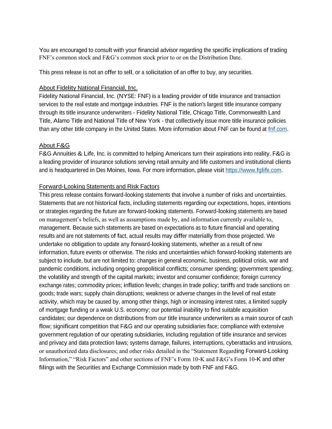 You are encouraged to consult with your financial advisor regarding the specific implications of trading FNF’s common stock and F&G’s common stock prior to or on the Distribution Date. This press release is not an offer to sell, or a solicitation of an offer to buy, any securities. About Fidelity National Financial, Inc. Fidelity National Financial, Inc. (NYSE: FNF) is a leading provider of title insurance and transaction services to the real estate and mortgage industries. FNF is the nation's largest title insurance company through its title insurance underwriters - Fidelity National Title, Chicago Title, Commonwealth Land Title, Alamo Title and National Title of New York - that collectively issue more title insurance policies than any other title company in the United States. More information about FNF can be found at fnf.com. About F&G F&G Annuities & Life, Inc. is committed to helping Americans turn their aspirations into reality. F&G is a leading provider of insurance solutions serving retail annuity and life customers and institutional clients and is headquartered in Des Moines, Iowa. For more information, please visit https://www.fglife.com. Forward-Looking Statements and Risk Factors This press release contains forward-looking statements that involve a number of risks and uncertainties. Statements that are not historical facts, including statements regarding our expectations, hopes, intentions or strategies regarding the future are forward-looking statements. Forward-looking statements are based on management’s beliefs, as well as assumptions made by, and information currently available to, management. Because such statements are based on expectations as to future financial and operating results and are not statements of fact, actual results may differ materially from those projected. We undertake no obligation to update any forward-looking statements, whether as a result of new information, future events or otherwise. The risks and uncertainties which forward-looking statements are subject to include, but are not limited to: changes in general economic, business, political crisis, war and pandemic conditions, including ongoing geopolitical conflicts; consumer spending; government spending; the volatility and strength of the capital markets; investor and consumer confidence; foreign currency exchange rates; commodity prices; inflation levels; changes in trade policy; tariffs and trade sanctions on goods; trade wars; supply chain disruptions; weakness or adverse changes in the level of real estate activity, which may be caused by, among other things, high or increasing interest rates, a limited supply of mortgage funding or a weak U.S. economy; our potential inability to find suitable acquisition candidates; our dependence on distributions from our title insurance underwriters as a main source of cash flow; significant competition that F&G and our operating subsidiaries face; compliance with extensive government regulation of our operating subsidiaries, including regulation of title insurance and services and privacy and data protection laws; systems damage, failures, interruptions, cyberattacks and intrusions, or unauthorized data disclosures; and other risks detailed in the “Statement Regarding Forward-Looking Information,” “Risk Factors” and other sections of FNF’s Form 10-K and F&G’s Form 10-K and other filings with the Securities and Exchange Commission made by both FNF and F&G.