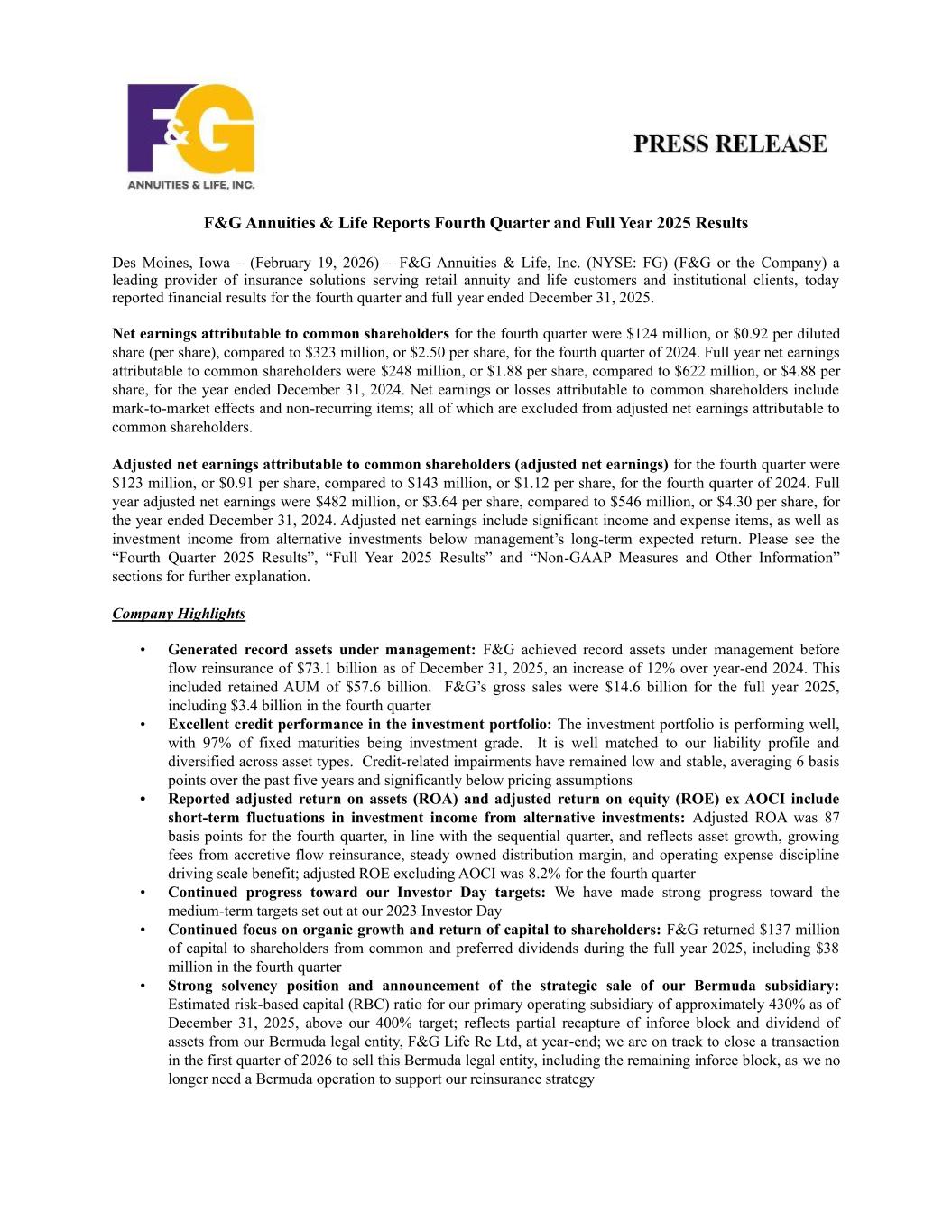 F&G Annuities & Life Reports Fourth Quarter and Full Year 2025 Results Des Moines, Iowa – (February 19, 2026) – F&G Annuities & Life, Inc. (NYSE: FG) (F&G or the Company) a leading provider of insurance solutions serving retail annuity and life customers and institutional clients, today reported financial results for the fourth quarter and full year ended December 31, 2025. Net earnings attributable to common shareholders for the fourth quarter were $124 million, or $0.92 per diluted share (per share), compared to $323 million, or $2.50 per share, for the fourth quarter of 2024. Full year net earnings attributable to common shareholders were $248 million, or $1.88 per share, compared to $622 million, or $4.88 per share, for the year ended December 31, 2024. Net earnings or losses attributable to common shareholders include mark-to-market effects and non-recurring items; all of which are excluded from adjusted net earnings attributable to common shareholders. Adjusted net earnings attributable to common shareholders (adjusted net earnings) for the fourth quarter were $123 million, or $0.91 per share, compared to $143 million, or $1.12 per share, for the fourth quarter of 2024. Full year adjusted net earnings were $482 million, or $3.64 per share, compared to $546 million, or $4.30 per share, for the year ended December 31, 2024. Adjusted net earnings include significant income and expense items, as well as investment income from alternative investments below management’s long-term expected return. Please see the “Fourth Quarter 2025 Results”, “Full Year 2025 Results” and “Non-GAAP Measures and Other Information” sections for further explanation. Company Highlights • Generated record assets under management: F&G achieved record assets under management before flow reinsurance of $73.1 billion as of December 31, 2025, an increase of 12% over year-end 2024. This included retained AUM of $57.6 billion. F&G’s gross sales were $14.6 billion for the full year 2025, including $3.4 billion in the fourth quarter • Excellent credit performance in the investment portfolio: The investment portfolio is performing well, with 97% of fixed maturities being investment grade. It is well matched to our liability profile and diversified across asset types. Credit-related impairments have remained low and stable, averaging 6 basis points over the past five years and significantly below pricing assumptions • Reported adjusted return on assets (ROA) and adjusted return on equity (ROE) ex AOCI include short-term fluctuations in investment income from alternative investments: Adjusted ROA was 87 basis points for the fourth quarter, in line with the sequential quarter, and reflects asset growth, growing fees from accretive flow reinsurance, steady owned distribution margin, and operating expense discipline driving scale benefit; adjusted ROE excluding AOCI was 8.2% for the fourth quarter • Continued progress toward our Investor Day targets: We have made strong progress toward the medium-term targets set out at our 2023 Investor Day • Continued focus on organic growth and return of capital to shareholders: F&G returned $137 million of capital to shareholders from common and preferred dividends during the full year 2025, including $38 million in the fourth quarter • Strong solvency position and announcement of the strategic sale of our Bermuda subsidiary: Estimated risk-based capital (RBC) ratio for our primary operating subsidiary of approximately 430% as of December 31, 2025, above our 400% target; reflects partial recapture of inforce block and dividend of assets from our Bermuda legal entity, F&G Life Re Ltd, at year-end; we are on track to close a transaction in the first quarter of 2026 to sell this Bermuda legal entity, including the remaining inforce block, as we no longer need a Bermuda operation to support our reinsurance strategy