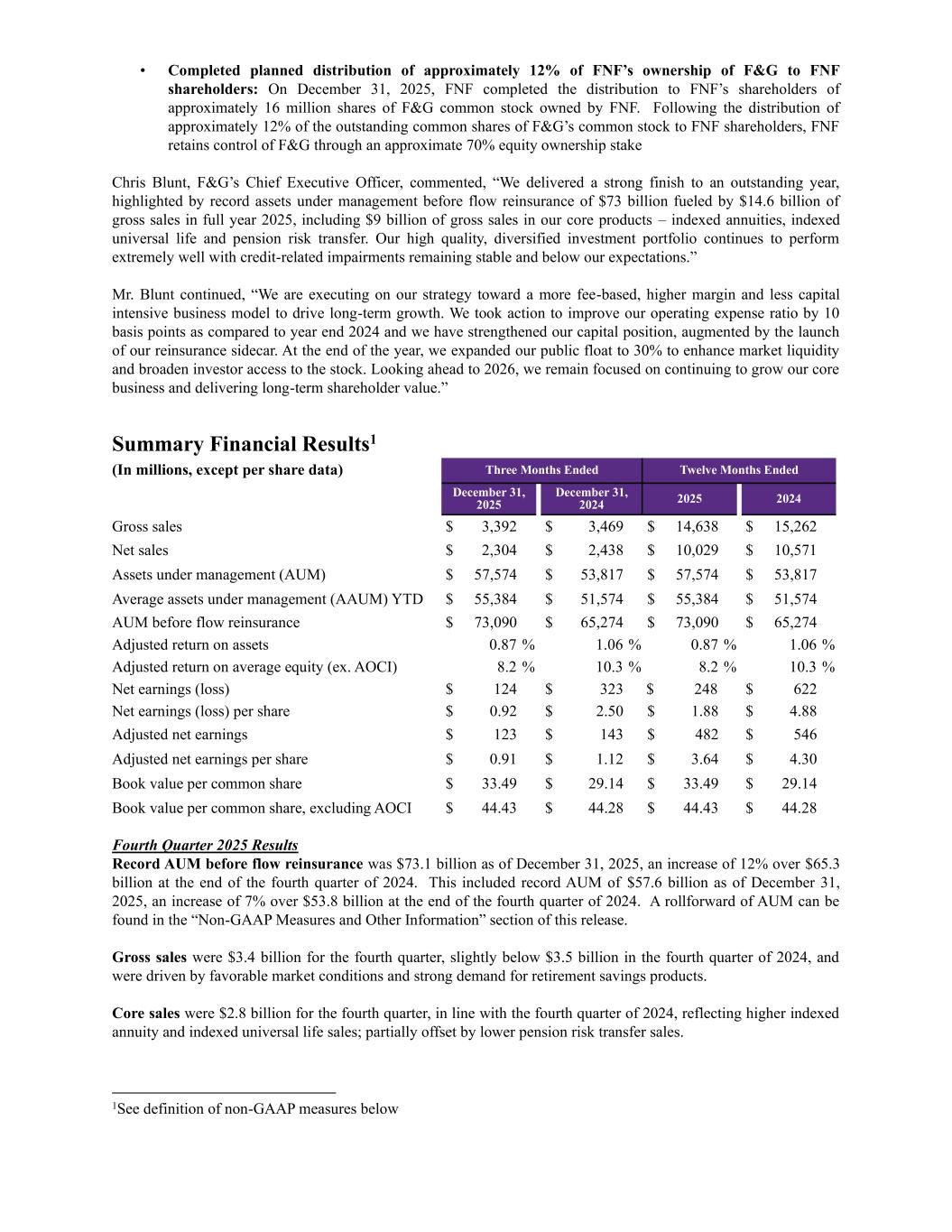 • Completed planned distribution of approximately 12% of FNF’s ownership of F&G to FNF shareholders: On December 31, 2025, FNF completed the distribution to FNF’s shareholders of approximately 16 million shares of F&G common stock owned by FNF. Following the distribution of approximately 12% of the outstanding common shares of F&G’s common stock to FNF shareholders, FNF retains control of F&G through an approximate 70% equity ownership stake Chris Blunt, F&G’s Chief Executive Officer, commented, “We delivered a strong finish to an outstanding year, highlighted by record assets under management before flow reinsurance of $73 billion fueled by $14.6 billion of gross sales in full year 2025, including $9 billion of gross sales in our core products – indexed annuities, indexed universal life and pension risk transfer. Our high quality, diversified investment portfolio continues to perform extremely well with credit-related impairments remaining stable and below our expectations.” Mr. Blunt continued, “We are executing on our strategy toward a more fee-based, higher margin and less capital intensive business model to drive long-term growth. We took action to improve our operating expense ratio by 10 basis points as compared to year end 2024 and we have strengthened our capital position, augmented by the launch of our reinsurance sidecar. At the end of the year, we expanded our public float to 30% to enhance market liquidity and broaden investor access to the stock. Looking ahead to 2026, we remain focused on continuing to grow our core business and delivering long-term shareholder value.” Summary Financial Results1 (In millions, except per share data) Three Months Ended Twelve Months Ended December 31, 2025 December 31, 2024 2025 2024 Gross sales $ 3,392 $ 3,469 $ 14,638 $ 15,262 Net sales $ 2,304 $ 2,438 $ 10,029 $ 10,571 Assets under management (AUM) $ 57,574 $ 53,817 $ 57,574 $ 53,817 Average assets under management (AAUM) YTD $ 55,384 $ 51,574 $ 55,384 $ 51,574 AUM before flow reinsurance $ 73,090 $ 65,274 $ 73,090 $ 65,274 Adjusted return on assets 0.87 % 1.06 % 0.87 % 1.06 % Adjusted return on average equity (ex. AOCI) 8.2 % 10.3 % 8.2 % 10.3 % Net earnings (loss) $ 124 $ 323 $ 248 $ 622 Net earnings (loss) per share $ 0.92 $ 2.50 $ 1.88 $ 4.88 Adjusted net earnings $ 123 $ 143 $ 482 $ 546 Adjusted net earnings per share $ 0.91 $ 1.12 $ 3.64 $ 4.30 Book value per common share $ 33.49 $ 29.14 $ 33.49 $ 29.14 Book value per common share, excluding AOCI $ 44.43 $ 44.28 $ 44.43 $ 44.28 Fourth Quarter 2025 Results Record AUM before flow reinsurance was $73.1 billion as of December 31, 2025, an increase of 12% over $65.3 billion at the end of the fourth quarter of 2024. This included record AUM of $57.6 billion as of December 31, 2025, an increase of 7% over $53.8 billion at the end of the fourth quarter of 2024. A rollforward of AUM can be found in the “Non-GAAP Measures and Other Information” section of this release. Gross sales were $3.4 billion for the fourth quarter, slightly below $3.5 billion in the fourth quarter of 2024, and were driven by favorable market conditions and strong demand for retirement savings products. Core sales were $2.8 billion for the fourth quarter, in line with the fourth quarter of 2024, reflecting higher indexed annuity and indexed universal life sales; partially offset by lower pension risk transfer sales. 1See definition of non-GAAP measures below