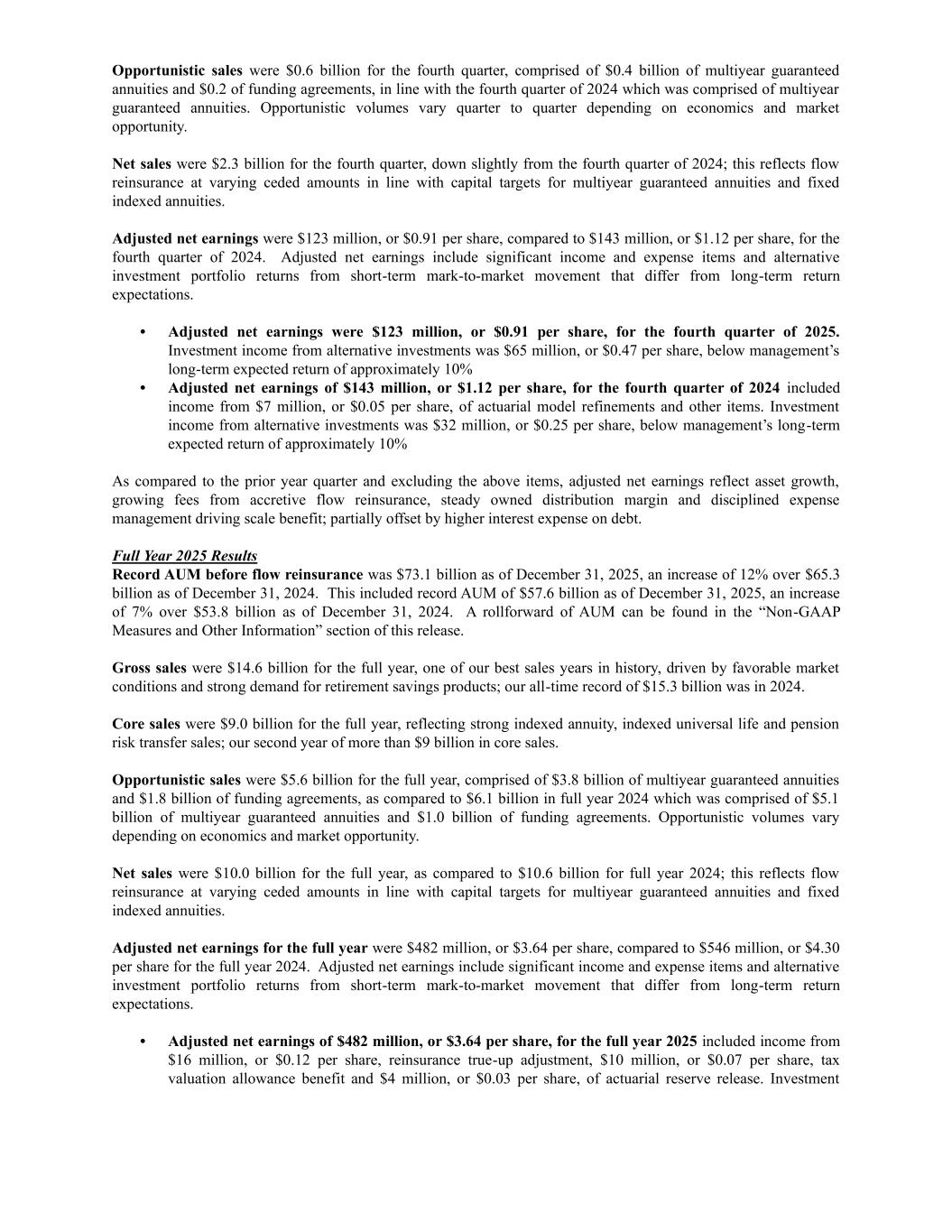 Opportunistic sales were $0.6 billion for the fourth quarter, comprised of $0.4 billion of multiyear guaranteed annuities and $0.2 of funding agreements, in line with the fourth quarter of 2024 which was comprised of multiyear guaranteed annuities. Opportunistic volumes vary quarter to quarter depending on economics and market opportunity. Net sales were $2.3 billion for the fourth quarter, down slightly from the fourth quarter of 2024; this reflects flow reinsurance at varying ceded amounts in line with capital targets for multiyear guaranteed annuities and fixed indexed annuities. Adjusted net earnings were $123 million, or $0.91 per share, compared to $143 million, or $1.12 per share, for the fourth quarter of 2024. Adjusted net earnings include significant income and expense items and alternative investment portfolio returns from short-term mark-to-market movement that differ from long-term return expectations. • Adjusted net earnings were $123 million, or $0.91 per share, for the fourth quarter of 2025. Investment income from alternative investments was $65 million, or $0.47 per share, below management’s long-term expected return of approximately 10% • Adjusted net earnings of $143 million, or $1.12 per share, for the fourth quarter of 2024 included income from $7 million, or $0.05 per share, of actuarial model refinements and other items. Investment income from alternative investments was $32 million, or $0.25 per share, below management’s long-term expected return of approximately 10% As compared to the prior year quarter and excluding the above items, adjusted net earnings reflect asset growth, growing fees from accretive flow reinsurance, steady owned distribution margin and disciplined expense management driving scale benefit; partially offset by higher interest expense on debt. Full Year 2025 Results Record AUM before flow reinsurance was $73.1 billion as of December 31, 2025, an increase of 12% over $65.3 billion as of December 31, 2024. This included record AUM of $57.6 billion as of December 31, 2025, an increase of 7% over $53.8 billion as of December 31, 2024. A rollforward of AUM can be found in the “Non-GAAP Measures and Other Information” section of this release. Gross sales were $14.6 billion for the full year, one of our best sales years in history, driven by favorable market conditions and strong demand for retirement savings products; our all-time record of $15.3 billion was in 2024. Core sales were $9.0 billion for the full year, reflecting strong indexed annuity, indexed universal life and pension risk transfer sales; our second year of more than $9 billion in core sales. Opportunistic sales were $5.6 billion for the full year, comprised of $3.8 billion of multiyear guaranteed annuities and $1.8 billion of funding agreements, as compared to $6.1 billion in full year 2024 which was comprised of $5.1 billion of multiyear guaranteed annuities and $1.0 billion of funding agreements. Opportunistic volumes vary depending on economics and market opportunity. Net sales were $10.0 billion for the full year, as compared to $10.6 billion for full year 2024; this reflects flow reinsurance at varying ceded amounts in line with capital targets for multiyear guaranteed annuities and fixed indexed annuities. Adjusted net earnings for the full year were $482 million, or $3.64 per share, compared to $546 million, or $4.30 per share for the full year 2024. Adjusted net earnings include significant income and expense items and alternative investment portfolio returns from short-term mark-to-market movement that differ from long-term return expectations. • Adjusted net earnings of $482 million, or $3.64 per share, for the full year 2025 included income from $16 million, or $0.12 per share, reinsurance true-up adjustment, $10 million, or $0.07 per share, tax valuation allowance benefit and $4 million, or $0.03 per share, of actuarial reserve release. Investment