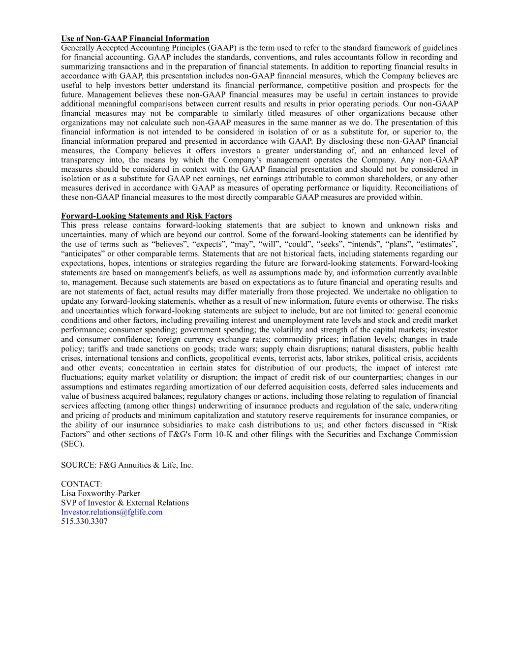 Use of Non-GAAP Financial Information Generally Accepted Accounting Principles (GAAP) is the term used to refer to the standard framework of guidelines for financial accounting. GAAP includes the standards, conventions, and rules accountants follow in recording and summarizing transactions and in the preparation of financial statements. In addition to reporting financial results in accordance with GAAP, this presentation includes non-GAAP financial measures, which the Company believes are useful to help investors better understand its financial performance, competitive position and prospects for the future. Management believes these non-GAAP financial measures may be useful in certain instances to provide additional meaningful comparisons between current results and results in prior operating periods. Our non-GAAP financial measures may not be comparable to similarly titled measures of other organizations because other organizations may not calculate such non-GAAP measures in the same manner as we do. The presentation of this financial information is not intended to be considered in isolation of or as a substitute for, or superior to, the financial information prepared and presented in accordance with GAAP. By disclosing these non-GAAP financial measures, the Company believes it offers investors a greater understanding of, and an enhanced level of transparency into, the means by which the Company’s management operates the Company. Any non-GAAP measures should be considered in context with the GAAP financial presentation and should not be considered in isolation or as a substitute for GAAP net earnings, net earnings attributable to common shareholders, or any other measures derived in accordance with GAAP as measures of operating performance or liquidity. Reconciliations of these non-GAAP financial measures to the most directly comparable GAAP measures are provided within. Forward-Looking Statements and Risk Factors This press release contains forward-looking statements that are subject to known and unknown risks and uncertainties, many of which are beyond our control. Some of the forward-looking statements can be identified by the use of terms such as “believes”, “expects”, “may”, “will”, “could”, “seeks”, “intends”, “plans”, “estimates”, “anticipates” or other comparable terms. Statements that are not historical facts, including statements regarding our expectations, hopes, intentions or strategies regarding the future are forward-looking statements. Forward-looking statements are based on management's beliefs, as well as assumptions made by, and information currently available to, management. Because such statements are based on expectations as to future financial and operating results and are not statements of fact, actual results may differ materially from those projected. We undertake no obligation to update any forward-looking statements, whether as a result of new information, future events or otherwise. The risks and uncertainties which forward-looking statements are subject to include, but are not limited to: general economic conditions and other factors, including prevailing interest and unemployment rate levels and stock and credit market performance; consumer spending; government spending; the volatility and strength of the capital markets; investor and consumer confidence; foreign currency exchange rates; commodity prices; inflation levels; changes in trade policy; tariffs and trade sanctions on goods; trade wars; supply chain disruptions; natural disasters, public health crises, international tensions and conflicts, geopolitical events, terrorist acts, labor strikes, political crisis, accidents and other events; concentration in certain states for distribution of our products; the impact of interest rate fluctuations; equity market volatility or disruption; the impact of credit risk of our counterparties; changes in our assumptions and estimates regarding amortization of our deferred acquisition costs, deferred sales inducements and value of business acquired balances; regulatory changes or actions, including those relating to regulation of financial services affecting (among other things) underwriting of insurance products and regulation of the sale, underwriting and pricing of products and minimum capitalization and statutory reserve requirements for insurance companies, or the ability of our insurance subsidiaries to make cash distributions to us; and other factors discussed in “Risk Factors” and other sections of F&G's Form 10-K and other filings with the Securities and Exchange Commission (SEC). SOURCE: F&G Annuities & Life, Inc. CONTACT: Lisa Foxworthy-Parker SVP of Investor & External Relations Investor.relations@fglife.com 515.330.3307