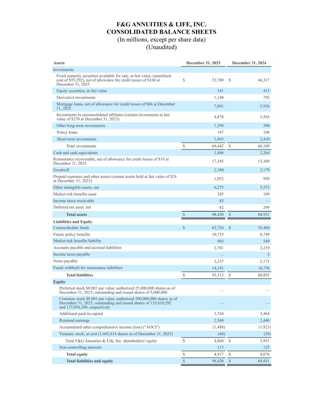 F&G ANNUITIES & LIFE, INC. CONSOLIDATED BALANCE SHEETS (In millions, except per share data) (Unaudited) Assets December 31, 2025 December 31, 2024 Investments Fixed maturity securities available for sale, at fair value, (amortized cost of $55,292), net of allowance for credit losses of $104 at December 31, 2025 $ 52,700 $ 46,317 Equity securities, at fair value 341 415 Derivative investments 1,148 792 Mortgage loans, net of allowance for credit losses of $86 at December 31, 2025 7,891 5,926 Investments in unconsolidated affiliates (certain investments at fair value of $270 at December 31, 2025) 4,878 3,565 Other long-term investments 1,294 580 Policy loans 147 104 Short-term investments 1,043 2,410 Total investments $ 69,442 $ 60,109 Cash and cash equivalents 1,486 2,264 Reinsurance recoverable, net of allowance for credit losses of $18 at December 31, 2025 17,545 13,369 Goodwill 2,180 2,179 Prepaid expenses and other assets (certain assets held at fair value of $24 at December 31, 2025) 1,052 950 Other intangible assets, net 6,275 5,572 Market risk benefits asset 285 189 Income taxes receivable 83 — Deferred tax asset, net 82 299 Total assets $ 98,430 $ 84,931 Liabilities and Equity Contractholder funds $ 62,726 $ 56,404 Future policy benefits 10,755 8,749 Market risk benefits liability 903 549 Accounts payable and accrued liabilities 2,701 2,219 Income taxes payable — 5 Notes payable 2,237 2,171 Funds withheld for reinsurance liabilities 14,191 10,758 Total liabilities $ 93,513 $ 80,855 Equity Preferred stock $0.001 par value; authorized 25,000,000 shares as of December 31, 2025; outstanding and issued shares of 5,000,000 — — Common stock $0.001 par value; authorized 500,000,000 shares as of December 31, 2025; outstanding and issued shares of 135,610,292 and 137,056,106, respectively — — Additional paid-in-capital 3,764 3,464 Retained earnings 2,568 2,440 Accumulated other comprehensive income (loss) ("AOCI") (1,488) (1,923) Treasury stock, at cost (1,445,814 shares as of December 31, 2025) (40) (30) Total F&G Annuities & Life, Inc. shareholders' equity $ 4,804 $ 3,951 Non-controlling interests 113 125 Total equity $ 4,917 $ 4,076 Total liabilities and equity $ 98,430 $ 84,931