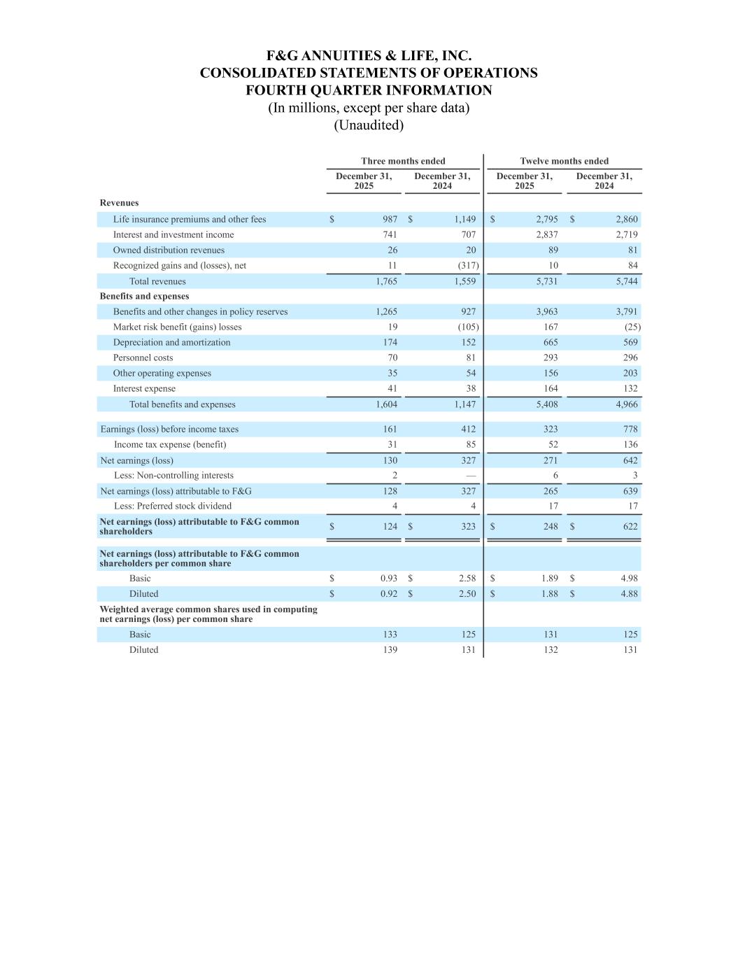 F&G ANNUITIES & LIFE, INC. CONSOLIDATED STATEMENTS OF OPERATIONS FOURTH QUARTER INFORMATION (In millions, except per share data) (Unaudited) Three months ended Twelve months ended December 31, 2025 December 31, 2024 December 31, 2025 December 31, 2024 Revenues Life insurance premiums and other fees $ 987 $ 1,149 $ 2,795 $ 2,860 Interest and investment income 741 707 2,837 2,719 Owned distribution revenues 26 20 89 81 Recognized gains and (losses), net 11 (317) 10 84 Total revenues 1,765 1,559 5,731 5,744 Benefits and expenses Benefits and other changes in policy reserves 1,265 927 3,963 3,791 Market risk benefit (gains) losses 19 (105) 167 (25) Depreciation and amortization 174 152 665 569 Personnel costs 70 81 293 296 Other operating expenses 35 54 156 203 Interest expense 41 38 164 132 Total benefits and expenses 1,604 1,147 5,408 4,966 Earnings (loss) before income taxes 161 412 323 778 Income tax expense (benefit) 31 85 52 136 Net earnings (loss) 130 327 271 642 Less: Non-controlling interests 2 — 6 3 Net earnings (loss) attributable to F&G 128 327 265 639 Less: Preferred stock dividend 4 4 17 17 Net earnings (loss) attributable to F&G common shareholders $ 124 $ 323 $ 248 $ 622 Net earnings (loss) attributable to F&G common shareholders per common share Basic $ 0.93 $ 2.58 $ 1.89 $ 4.98 Diluted $ 0.92 $ 2.50 $ 1.88 $ 4.88 Weighted average common shares used in computing net earnings (loss) per common share Basic 133 125 131 125 Diluted 139 131 132 131
