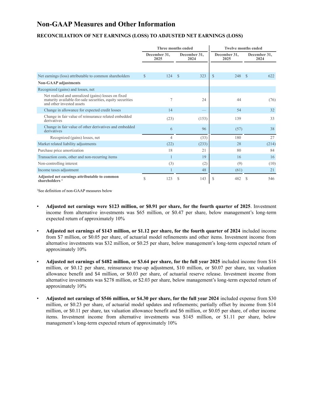 Non-GAAP Measures and Other Information RECONCILIATION OF NET EARNINGS (LOSS) TO ADJUSTED NET EARNINGS (LOSS) Three months ended Twelve months ended December 31, 2025 December 31, 2024 December 31, 2025 December 31, 2024 Net earnings (loss) attributable to common shareholders $ 124 $ 323 $ 248 $ 622 Non-GAAP adjustments Recognized (gains) and losses, net Net realized and unrealized (gains) losses on fixed maturity available-for-sale securities, equity securities and other invested assets 7 24 44 (76) Change in allowance for expected credit losses 14 — 54 32 Change in fair value of reinsurance related embedded derivatives (23) (153) 139 33 Change in fair value of other derivatives and embedded derivatives 6 96 (57) 38 Recognized (gains) losses, net 4 (33) 180 27 Market related liability adjustments (22) (233) 28 (214) Purchase price amortization 18 21 80 84 Transaction costs, other and non-recurring items 1 19 16 16 Non-controlling interest (3) (2) (9) (10) Income taxes adjustment 1 48 (61) 21 Adjusted net earnings attributable to common shareholders ¹ $ 123 $ 143 $ 482 $ 546 1See definition of non-GAAP measures below • Adjusted net earnings were $123 million, or $0.91 per share, for the fourth quarter of 2025. Investment income from alternative investments was $65 million, or $0.47 per share, below management’s long-term expected return of approximately 10% • Adjusted net earnings of $143 million, or $1.12 per share, for the fourth quarter of 2024 included income from $7 million, or $0.05 per share, of actuarial model refinements and other items. Investment income from alternative investments was $32 million, or $0.25 per share, below management’s long-term expected return of approximately 10% • Adjusted net earnings of $482 million, or $3.64 per share, for the full year 2025 included income from $16 million, or $0.12 per share, reinsurance true-up adjustment, $10 million, or $0.07 per share, tax valuation allowance benefit and $4 million, or $0.03 per share, of actuarial reserve release. Investment income from alternative investments was $278 million, or $2.03 per share, below management’s long-term expected return of approximately 10% • Adjusted net earnings of $546 million, or $4.30 per share, for the full year 2024 included expense from $30 million, or $0.23 per share, of actuarial model updates and refinements; partially offset by income from $14 million, or $0.11 per share, tax valuation allowance benefit and $6 million, or $0.05 per share, of other income items. Investment income from alternative investments was $145 million, or $1.11 per share, below management’s long-term expected return of approximately 10%