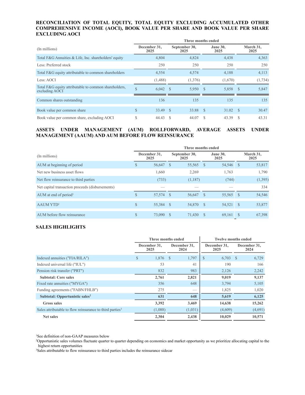RECONCILIATION OF TOTAL EQUITY, TOTAL EQUITY EXCLUDING ACCUMULATED OTHER COMPREHENSIVE INCOME (AOCI), BOOK VALUE PER SHARE AND BOOK VALUE PER SHARE EXCLUDING AOCI Three months ended (In millions) December 31, 2025 September 30, 2025 June 30, 2025 March 31, 2025 Total F&G Annuities & Life, Inc. shareholders' equity 4,804 4,824 4,438 4,363 Less: Preferred stock 250 250 250 250 Total F&G equity attributable to common shareholders 4,554 4,574 4,188 4,113 Less: AOCI (1,488) (1,376) (1,670) (1,734) Total F&G equity attributable to common shareholders, excluding AOCI $ 6,042 $ 5,950 $ 5,858 $ 5,847 Common shares outstanding 136 135 135 135 Book value per common share $ 33.49 $ 33.88 $ 31.02 $ 30.47 Book value per common share, excluding AOCI $ 44.43 $ 44.07 $ 43.39 $ 43.31 ASSETS UNDER MANAGEMENT (AUM) ROLLFORWARD, AVERAGE ASSETS UNDER MANAGEMENT (AAUM) AND AUM BEFORE FLOW REINSURANCE Three months ended (In millions) December 31, 2025 September 30, 2025 June 30, 2025 March 31, 2025 AUM at beginning of period $ 56,647 $ 55,565 $ 54,546 $ 53,817 Net new business asset flows 1,660 2,269 1,763 1,790 Net flow reinsurance to third parties (733) (1,187) (744) (1,395) Net capital transaction proceeds (disbursements) — — — 334 AUM at end of period¹ $ 57,574 $ 56,647 $ 55,565 $ 54,546 AAUM YTD¹ $ 55,384 $ 54,870 $ 54,521 $ 53,877 AUM before flow reinsurance $ 73,090 $ 71,430 $ 69,161 $ 67,398 SALES HIGHLIGHTS Three months ended Twelve months ended December 31, 2025 December 31, 2024 December 31, 2025 December 31, 2024 Indexed annuities ("FIA/RILA") $ 1,876 $ 1,797 $ 6,703 $ 6,729 Indexed universal life ("IUL") 53 41 190 166 Pension risk transfer ("PRT") 832 983 2,126 2,242 Subtotal: Core sales 2,761 2,821 9,019 9,137 Fixed rate annuities ("MYGA") 356 648 3,794 5,105 Funding agreements ("FABN/FHLB") 275 — 1,825 1,020 Subtotal: Opportunistic sales2 631 648 5,619 6,125 Gross sales 3,392 3,469 14,638 15,262 Sales attributable to flow reinsurance to third parties3 (1,088) (1,031) (4,609) (4,691) Net sales 2,304 2,438 10,029 10,571 1See definition of non-GAAP measures below 2Opportunistic sales volumes fluctuate quarter to quarter depending on economics and market opportunity as we prioritize allocating capital to the highest return opportunities 3Sales attributable to flow reinsurance to third parties includes the reinsurance sidecar
