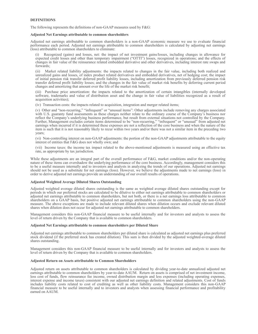 DEFINITIONS The following represents the definitions of non-GAAP measures used by F&G: Adjusted Net Earnings attributable to common shareholders Adjusted net earnings attributable to common shareholders is a non-GAAP economic measure we use to evaluate financial performance each period. Adjusted net earnings attributable to common shareholders is calculated by adjusting net earnings (loss) attributable to common shareholders to eliminate: (i) Recognized (gains) and losses, net: the impact of net investment gains/losses, including changes in allowance for expected credit losses and other than temporary impairment (“OTTI”) losses, recognized in operations; and the effects of changes in fair value of the reinsurance related embedded derivative and other derivatives, including interest rate swaps and forwards; (ii) Market related liability adjustments: the impacts related to changes in the fair value, including both realized and unrealized gains and losses, of index product related derivatives and embedded derivatives, net of hedging cost; the impact of initial pension risk transfer deferred profit liability losses, including amortization from previously deferred pension risk transfer deferred profit liability losses; and the changes in the fair value of market risk benefits by deferring current period changes and amortizing that amount over the life of the market risk benefit; (iii) Purchase price amortization: the impacts related to the amortization of certain intangibles (internally developed software, trademarks and value of distribution asset and the change in fair value of liabilities recognized as a result of acquisition activities); (iv) Transaction costs: the impacts related to acquisition, integration and merger related items; (v) Other and “non-recurring,” “infrequent” or “unusual items”: Other adjustments include removing any charges associated with U.S. guaranty fund assessments as these charges neither relate to the ordinary course of the Company’s business nor reflect the Company’s underlying business performance, but result from external situations not controlled by the Company. Further, Management excludes certain items determined to be “non-recurring,” “infrequent” or “unusual” from adjusted net earnings when incurred if it is determined these expenses are not a reflection of the core business and when the nature of the item is such that it is not reasonably likely to recur within two years and/or there was not a similar item in the preceding two years; (vi) Non-controlling interest on non-GAAP adjustments: the portion of the non-GAAP adjustments attributable to the equity interest of entities that F&G does not wholly own; and (vii) Income taxes: the income tax impact related to the above-mentioned adjustments is measured using an effective tax rate, as appropriate by tax jurisdiction. While these adjustments are an integral part of the overall performance of F&G, market conditions and/or the non-operating nature of these items can overshadow the underlying performance of the core business. Accordingly, management considers this to be a useful measure internally and to investors and analysts in analyzing the trends of our operations. Adjusted net earnings should not be used as a substitute for net earnings (loss). However, we believe the adjustments made to net earnings (loss) in order to derive adjusted net earnings provide an understanding of our overall results of operations. Adjusted Weighted Average Diluted Shares Outstanding Adjusted weighted average diluted shares outstanding is the same as weighted average diluted shares outstanding except for periods in which our preferred stocks are calculated to be dilutive to either net earnings attributable to common shareholders or adjusted net earnings attributable to common shareholders, but not both, or there is a net earnings loss attributable to common shareholders on a GAAP basis, but positive adjusted net earnings attributable to common shareholders using the non-GAAP measure. The above exceptions are made to include relevant diluted shares when dilution occurs and exclude relevant diluted shares when dilution does not occur for adjusted net earnings attributable to common shareholders. Management considers this non-GAAP financial measure to be useful internally and for investors and analysts to assess the level of return driven by the Company that is available to common shareholders. Adjusted Net Earnings attributable to common shareholders per Diluted Share Adjusted net earnings attributable to common shareholders per diluted share is calculated as adjusted net earnings plus preferred stock dividend (if the preferred stock has created dilution). This sum is then divided by the adjusted weighted-average diluted shares outstanding. Management considers this non-GAAP financial measure to be useful internally and for investors and analysts to assess the level of return driven by the Company that is available to common shareholders. Adjusted Return on Assets attributable to Common Shareholders Adjusted return on assets attributable to common shareholders is calculated by dividing year-to-date annualized adjusted net earnings attributable to common shareholders by year-to-date AAUM. Return on assets is comprised of net investment income, less cost of funds, flow reinsurance fee income, owned distribution margin and less expenses (including operating expenses, interest expense and income taxes) consistent with our adjusted net earnings definition and related adjustments. Cost of funds includes liability costs related to cost of crediting as well as other liability costs. Management considers this non-GAAP financial measure to be useful internally and to investors and analysts when assessing financial performance and profitability earned on AAUM.