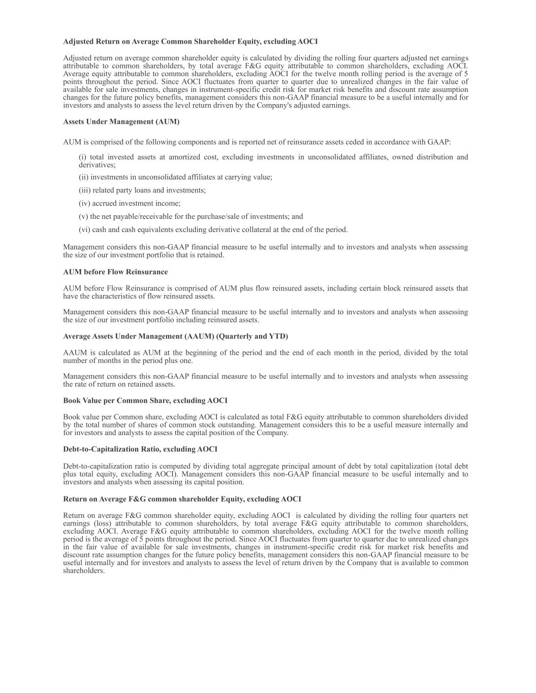 Adjusted Return on Average Common Shareholder Equity, excluding AOCI Adjusted return on average common shareholder equity is calculated by dividing the rolling four quarters adjusted net earnings attributable to common shareholders, by total average F&G equity attributable to common shareholders, excluding AOCI. Average equity attributable to common shareholders, excluding AOCI for the twelve month rolling period is the average of 5 points throughout the period. Since AOCI fluctuates from quarter to quarter due to unrealized changes in the fair value of available for sale investments, changes in instrument-specific credit risk for market risk benefits and discount rate assumption changes for the future policy benefits, management considers this non-GAAP financial measure to be a useful internally and for investors and analysts to assess the level return driven by the Company's adjusted earnings. Assets Under Management (AUM) AUM is comprised of the following components and is reported net of reinsurance assets ceded in accordance with GAAP: (i) total invested assets at amortized cost, excluding investments in unconsolidated affiliates, owned distribution and derivatives; (ii) investments in unconsolidated affiliates at carrying value; (iii) related party loans and investments; (iv) accrued investment income; (v) the net payable/receivable for the purchase/sale of investments; and (vi) cash and cash equivalents excluding derivative collateral at the end of the period. Management considers this non-GAAP financial measure to be useful internally and to investors and analysts when assessing the size of our investment portfolio that is retained. AUM before Flow Reinsurance AUM before Flow Reinsurance is comprised of AUM plus flow reinsured assets, including certain block reinsured assets that have the characteristics of flow reinsured assets. Management considers this non-GAAP financial measure to be useful internally and to investors and analysts when assessing the size of our investment portfolio including reinsured assets. Average Assets Under Management (AAUM) (Quarterly and YTD) AAUM is calculated as AUM at the beginning of the period and the end of each month in the period, divided by the total number of months in the period plus one. Management considers this non-GAAP financial measure to be useful internally and to investors and analysts when assessing the rate of return on retained assets. Book Value per Common Share, excluding AOCI Book value per Common share, excluding AOCI is calculated as total F&G equity attributable to common shareholders divided by the total number of shares of common stock outstanding. Management considers this to be a useful measure internally and for investors and analysts to assess the capital position of the Company. Debt-to-Capitalization Ratio, excluding AOCI Debt-to-capitalization ratio is computed by dividing total aggregate principal amount of debt by total capitalization (total debt plus total equity, excluding AOCI). Management considers this non-GAAP financial measure to be useful internally and to investors and analysts when assessing its capital position. Return on Average F&G common shareholder Equity, excluding AOCI Return on average F&G common shareholder equity, excluding AOCI is calculated by dividing the rolling four quarters net earnings (loss) attributable to common shareholders, by total average F&G equity attributable to common shareholders, excluding AOCI. Average F&G equity attributable to common shareholders, excluding AOCI for the twelve month rolling period is the average of 5 points throughout the period. Since AOCI fluctuates from quarter to quarter due to unrealized changes in the fair value of available for sale investments, changes in instrument-specific credit risk for market risk benefits and discount rate assumption changes for the future policy benefits, management considers this non-GAAP financial measure to be useful internally and for investors and analysts to assess the level of return driven by the Company that is available to common shareholders.