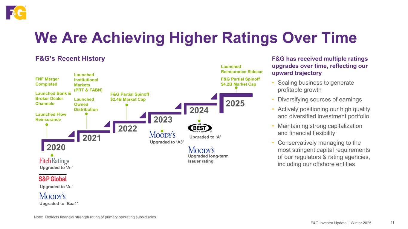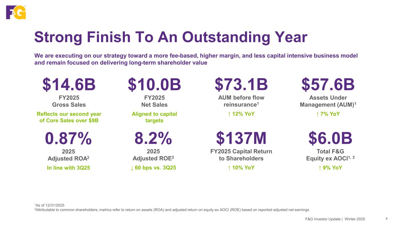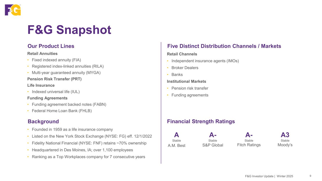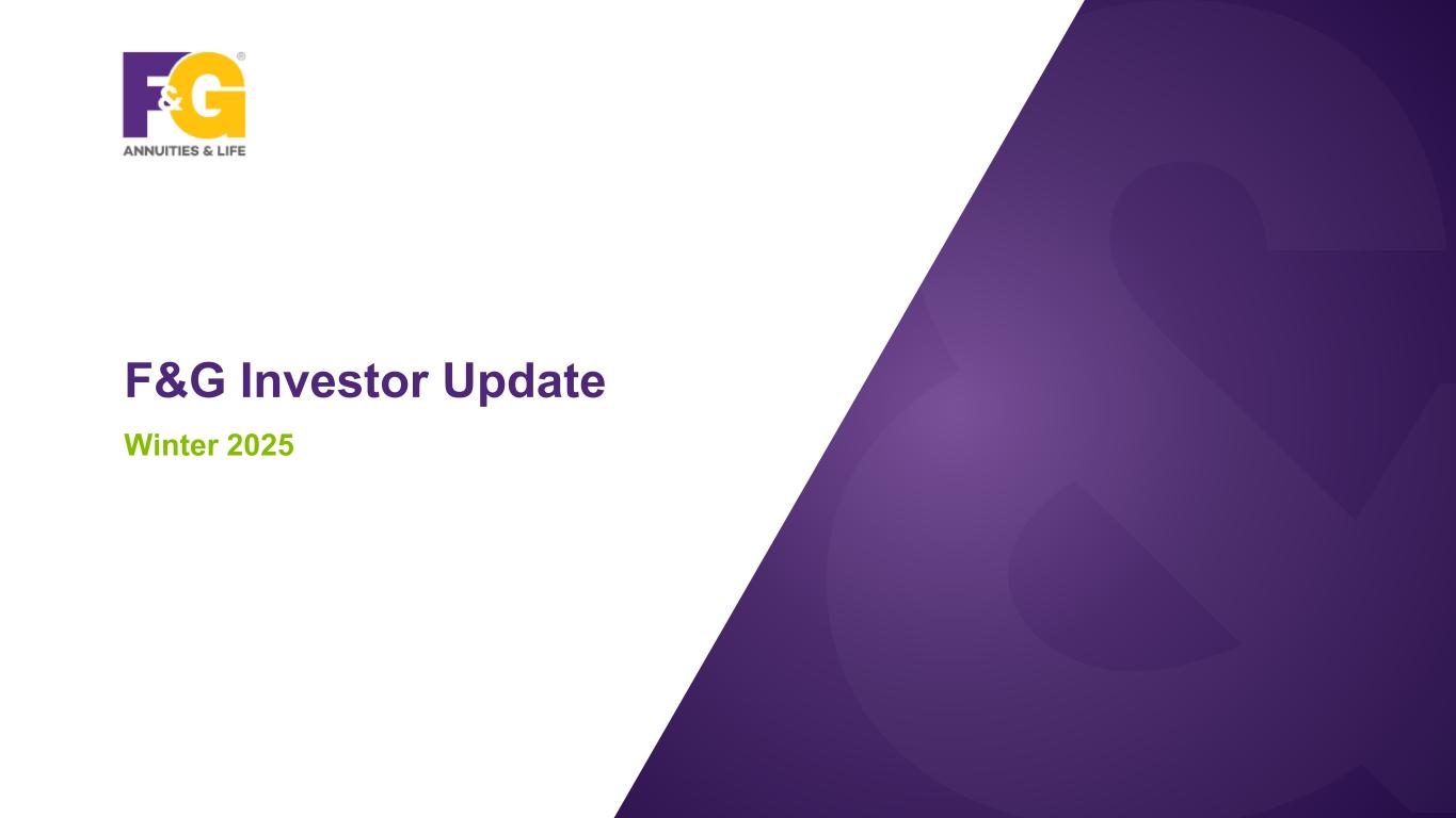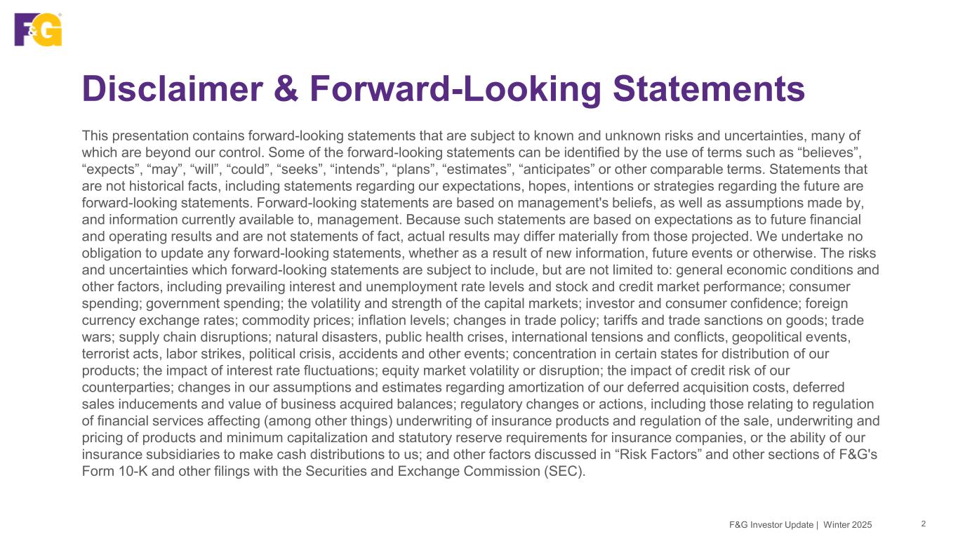 Disclaimer & Forward-Looking Statements 2F&G Investor Update | Winter 2025 This presentation contains forward-looking statements that are subject to known and unknown risks and uncertainties, many of which are beyond our control. Some of the forward-looking statements can be identified by the use of terms such as “believes”, “expects”, “may”, “will”, “could”, “seeks”, “intends”, “plans”, “estimates”, “anticipates” or other comparable terms. Statements that are not historical facts, including statements regarding our expectations, hopes, intentions or strategies regarding the future are forward-looking statements. Forward-looking statements are based on management's beliefs, as well as assumptions made by, and information currently available to, management. Because such statements are based on expectations as to future financial and operating results and are not statements of fact, actual results may differ materially from those projected. We undertake no obligation to update any forward-looking statements, whether as a result of new information, future events or otherwise. The risks and uncertainties which forward-looking statements are subject to include, but are not limited to: general economic conditions and other factors, including prevailing interest and unemployment rate levels and stock and credit market performance; consumer spending; government spending; the volatility and strength of the capital markets; investor and consumer confidence; foreign currency exchange rates; commodity prices; inflation levels; changes in trade policy; tariffs and trade sanctions on goods; trade wars; supply chain disruptions; natural disasters, public health crises, international tensions and conflicts, geopolitical events, terrorist acts, labor strikes, political crisis, accidents and other events; concentration in certain states for distribution of our products; the impact of interest rate fluctuations; equity market volatility or disruption; the impact of credit risk of our counterparties; changes in our assumptions and estimates regarding amortization of our deferred acquisition costs, deferred sales inducements and value of business acquired balances; regulatory changes or actions, including those relating to regulation of financial services affecting (among other things) underwriting of insurance products and regulation of the sale, underwriting and pricing of products and minimum capitalization and statutory reserve requirements for insurance companies, or the ability of our insurance subsidiaries to make cash distributions to us; and other factors discussed in “Risk Factors” and other sections of F&G's Form 10-K and other filings with the Securities and Exchange Commission (SEC).