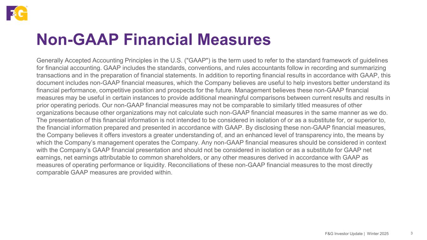 Non-GAAP Financial Measures 3F&G Investor Update | Winter 2025 Generally Accepted Accounting Principles in the U.S. ("GAAP") is the term used to refer to the standard framework of guidelines for financial accounting. GAAP includes the standards, conventions, and rules accountants follow in recording and summarizing transactions and in the preparation of financial statements. In addition to reporting financial results in accordance with GAAP, this document includes non-GAAP financial measures, which the Company believes are useful to help investors better understand its financial performance, competitive position and prospects for the future. Management believes these non-GAAP financial measures may be useful in certain instances to provide additional meaningful comparisons between current results and results in prior operating periods. Our non-GAAP financial measures may not be comparable to similarly titled measures of other organizations because other organizations may not calculate such non-GAAP financial measures in the same manner as we do. The presentation of this financial information is not intended to be considered in isolation of or as a substitute for, or superior to, the financial information prepared and presented in accordance with GAAP. By disclosing these non-GAAP financial measures, the Company believes it offers investors a greater understanding of, and an enhanced level of transparency into, the means by which the Company’s management operates the Company. Any non-GAAP financial measures should be considered in context with the Company’s GAAP financial presentation and should not be considered in isolation or as a substitute for GAAP net earnings, net earnings attributable to common shareholders, or any other measures derived in accordance with GAAP as measures of operating performance or liquidity. Reconciliations of these non-GAAP financial measures to the most directly comparable GAAP measures are provided within.