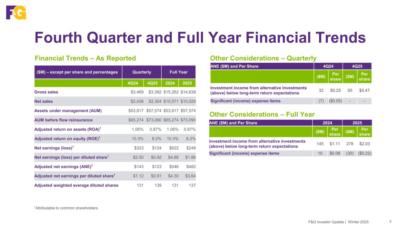 We are executing on our strategy toward a more fee-based, higher margin, and less capital intensive business model and remain focused on delivering long-term shareholder value 0.87% 2025 Adjusted ROA2 In line with 3Q25 Strong Finish To An Outstanding Year 4F&G Investor Update | Winter 2025 1As of 12/31/2025 2Attributable to common shareholders; metrics refer to return on assets (ROA) and adjusted return on equity ex AOCI (ROE) based on reported adjusted net earnings $14.6B FY2025 Gross Sales Reflects our second year of Core Sales over $9B $10.0B FY2025 Net Sales Aligned to capital targets $57.6B Assets Under Management (AUM)1 ↑ 7% YoY $73.1B AUM before flow reinsurance1 ↑ 12% YoY $137M FY2025 Capital Return to Shareholders ↑ 10% YoY $6.0B Total F&G Equity ex AOCI1, 2 ↑ 9% YoY 8.2% 2025 Adjusted ROE2 ↓ 60 bps vs. 3Q25