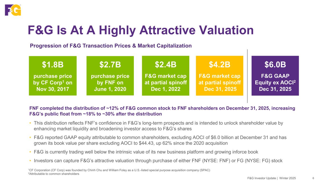 Fourth Quarter and Full Year Financial Trends 5F&G Investor Update | Winter 2025 Other Considerations – Full Year Other Considerations – Quarterly Financial Trends – As Reported ($M) – except per share and percentages Quarterly Full Year 4Q24 4Q25 2024 2025 Gross sales $3,469 $3,392 $15,262 $14,638 Net sales $2,438 $2,304 $10,571 $10,029 Assets under management (AUM) $53,817 $57,574 $53,817 $57,574 AUM before flow reinsurance $65,274 $73,090 $65,274 $73,090 Adjusted return on assets (ROA)1 1.06% 0.87% 1.06% 0.87% Adjusted return on equity (ROE)1 10.3% 8.2% 10.3% 8.2% Net earnings (loss)1 $323 $124 $622 $248 Net earnings (loss) per diluted share1 $2.50 $0.92 $4.88 $1.88 Adjusted net earnings (ANE)1 $143 $123 $546 $482 Adjusted net earnings per diluted share1 $1.12 $0.91 $4.30 $3.64 Adjusted weighted average diluted shares 131 139 131 137 ANE ($M) and Per Share 4Q24 4Q25 ($M) Per share ($M) Per share Investment income from alternative investments (above) below long-term return expectations 32 $0.25 65 $0.47 Significant (income) expense items (7) ($0.05) - - ANE ($M) and Per Share 2024 2025 ($M) Per share ($M) Per share Investment income from alternative investments (above) below long-term return expectations 145 $1.11 278 $2.03 Significant (income) expense items 10 $0.08 (30) ($0.22) 1Attributable to common shareholders