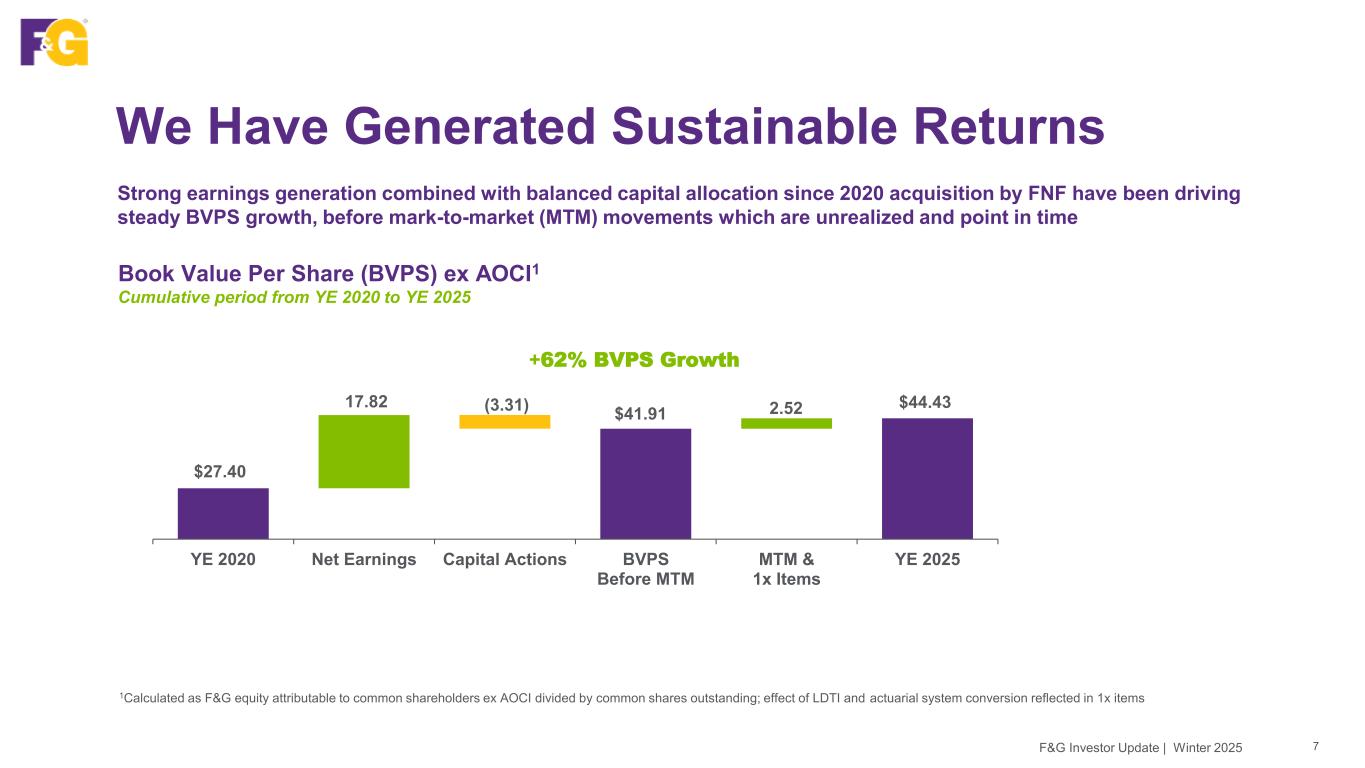 F&G Is At A Highly Attractive Valuation Progression of F&G Transaction Prices & Market Capitalization FNF completed the distribution of ~12% of F&G common stock to FNF shareholders on December 31, 2025, increasing F&G’s public float from ~18% to ~30% after the distribution • This distribution reflects FNF’s confidence in F&G’s long-term prospects and is intended to unlock shareholder value by enhancing market liquidity and broadening investor access to F&G’s shares • F&G reported GAAP equity attributable to common shareholders, excluding AOCI of $6.0 billion at December 31 and has grown its book value per share excluding AOCI to $44.43, up 62% since the 2020 acquisition • F&G is currently trading well below the intrinsic value of its new business platform and growing inforce book • Investors can capture F&G’s attractive valuation through purchase of either FNF (NYSE: FNF) or FG (NYSE: FG) stock $1.8B purchase price by CF Corp1 on Nov 30, 2017 $2.7B purchase price by FNF on June 1, 2020 $6.0B F&G GAAP Equity ex AOCI2 Dec 31, 2025 $2.4B F&G market cap at partial spinoff Dec 1, 2022 $4.2B F&G market cap at partial spinoff Dec 31, 2025 1CF Corporation (CF Corp) was founded by Chinh Chu and William Foley as a U.S.-listed special purpose acquisition company (SPAC) 2Attributable to common shareholders F&G Investor Update | Winter 2025 6