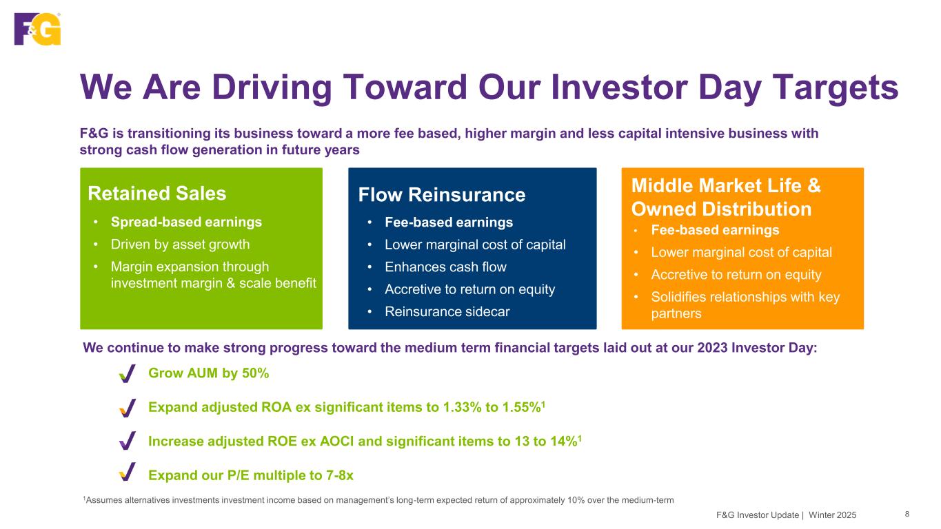 We Have Generated Sustainable Returns 7F&G Investor Update | Winter 2025 1Calculated as F&G equity attributable to common shareholders ex AOCI divided by common shares outstanding; effect of LDTI and actuarial system conversion reflected in 1x items Book Value Per Share (BVPS) ex AOCI1 Cumulative period from YE 2020 to YE 2025 $27.40 $41.91 $44.43 17.82 (3.31) 2.52 YE 2020 Net Earnings Capital Actions BVPS Before MTM MTM & 1x Items YE 2025 Strong earnings generation combined with balanced capital allocation since 2020 acquisition by FNF have been driving steady BVPS growth, before mark-to-market (MTM) movements which are unrealized and point in time +62% BVPS Growth