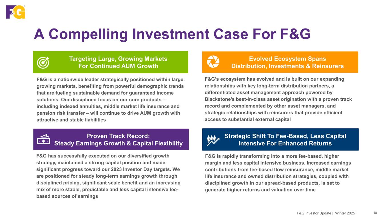 F&G Snapshot 9F&G Investor Update | Winter 2025 Retail Annuities • Fixed indexed annuity (FIA) • Registered index-linked annuities (RILA) • Multi-year guaranteed annuity (MYGA) Pension Risk Transfer (PRT) Life Insurance • Indexed universal life (IUL) Funding Agreements • Funding agreement backed notes (FABN) • Federal Home Loan Bank (FHLB) • Founded in 1959 as a life insurance company • Listed on the New York Stock Exchange (NYSE: FG) eff. 12/1/2022 • Fidelity National Financial (NYSE: FNF) retains ~70% ownership • Headquartered in Des Moines, IA; over 1,100 employees • Ranking as a Top Workplaces company for 7 consecutive years Retail Channels • Independent insurance agents (IMOs) • Broker Dealers • Banks Institutional Markets • Pension risk transfer • Funding agreements Our Product Lines Five Distinct Distribution Channels / Markets Background Financial Strength Ratings A Stable A.M. Best A- Stable S&P Global A- Stable Fitch Ratings A3 Stable Moody’s