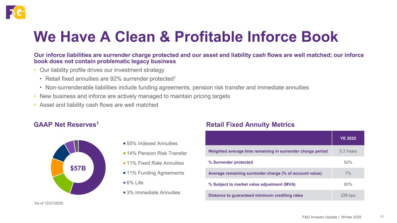 We Have A Clean & Profitable Inforce Book 11F&G Investor Update | Winter 2025 Our inforce liabilities are surrender charge protected and our asset and liability cash flows are well matched; our inforce book does not contain problematic legacy business • Our liability profile drives our investment strategy • Retail fixed annuities are 92% surrender protected1 • Non-surrenderable liabilities include funding agreements, pension risk transfer and immediate annuities • New business and inforce are actively managed to maintain pricing targets • Asset and liability cash flows are well matched 1As of 12/31/2025 GAAP Net Reserves1 55% Indexed Annuities 14% Pension Risk Transfer 11% Fixed Rate Annuities 11% Funding Agreements 6% Life 3% Immediate Annuities $57B Retail Fixed Annuity Metrics YE 2025 Weighted average time remaining in surrender charge period 5.3 Years % Surrender protected 92% Average remaining surrender charge (% of account value) 7% % Subject to market value adjustment (MVA) 80% Distance to guaranteed minimum crediting rates 226 bps