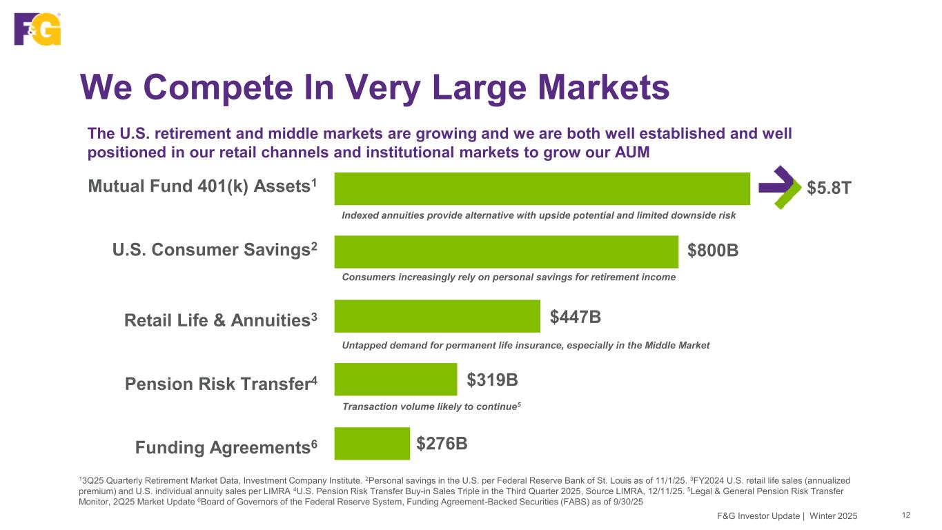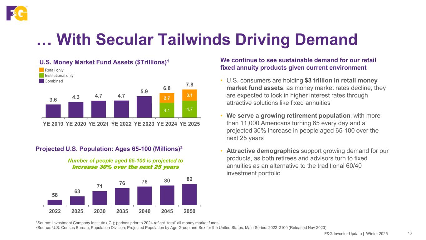 We Compete In Very Large Markets 12F&G Investor Update | Winter 2025 The U.S. retirement and middle markets are growing and we are both well established and well positioned in our retail channels and institutional markets to grow our AUM 13Q25 Quarterly Retirement Market Data, Investment Company Institute. 2Personal savings in the U.S. per Federal Reserve Bank of St. Louis as of 11/1/25. 3FY2024 U.S. retail life sales (annualized premium) and U.S. individual annuity sales per LIMRA 4U.S. Pension Risk Transfer Buy-in Sales Triple in the Third Quarter 2025, Source LIMRA, 12/11/25. 5Legal & General Pension Risk Transfer Monitor, 2Q25 Market Update 6Board of Governors of the Federal Reserve System, Funding Agreement-Backed Securities (FABS) as of 9/30/25 Indexed annuities provide alternative with upside potential and limited downside risk Consumers increasingly rely on personal savings for retirement income Transaction volume likely to continue5 Untapped demand for permanent life insurance, especially in the Middle Market Mutual Fund 401(k) Assets1 U.S. Consumer Savings2 Retail Life & Annuities3 Pension Risk Transfer4 Funding Agreements6 $5.8T $800B $319B $447B $276B