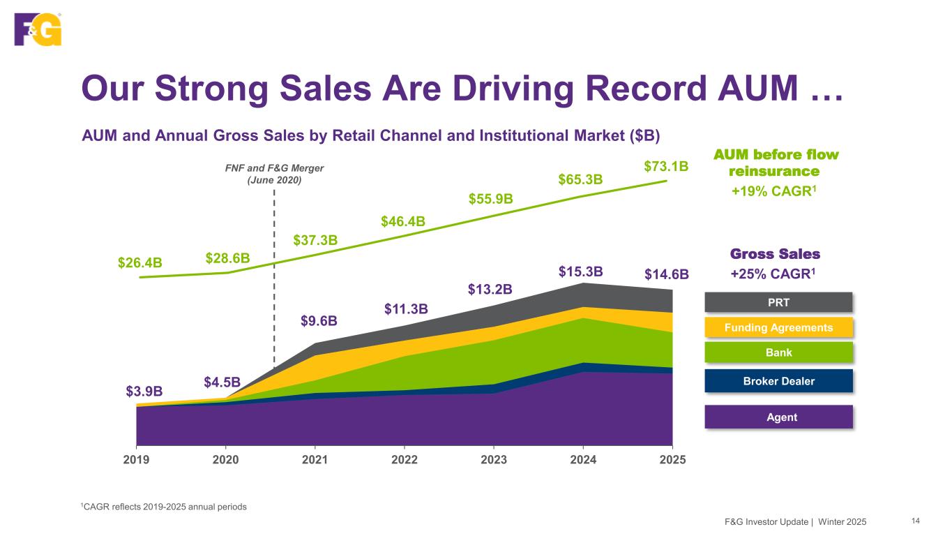 58 63 71 76 78 80 82 2022 2025 2030 2035 2040 2045 2050 … With Secular Tailwinds Driving Demand 13F&G Investor Update | Winter 2025 We continue to see sustainable demand for our retail fixed annuity products given current environment • U.S. consumers are holding $3 trillion in retail money market fund assets; as money market rates decline, they are expected to lock in higher interest rates through attractive solutions like fixed annuities • We serve a growing retirement population, with more than 11,000 Americans turning 65 every day and a projected 30% increase in people aged 65-100 over the next 25 years • Attractive demographics support growing demand for our products, as both retirees and advisors turn to fixed annuities as an alternative to the traditional 60/40 investment portfolio 1Source: Investment Company Institute (ICI); periods prior to 2024 reflect “total” all money market funds 2Source: U.S. Census Bureau, Population Division; Projected Population by Age Group and Sex for the United States, Main Series: 2022-2100 (Released Nov 2023) U.S. Money Market Fund Assets ($Trillions)1 Projected U.S. Population: Ages 65-100 (Millions)2 Number of people aged 65-100 is projected to increase 30% over the next 25 years 4.1 4.7 2.7 3.1 3.6 4.3 4.7 4.7 5.9 6.8 7.8 YE 2019 YE 2020 YE 2021 YE 2022 YE 2023 YE 2024 YE 2025 Combined Institutional only Retail only