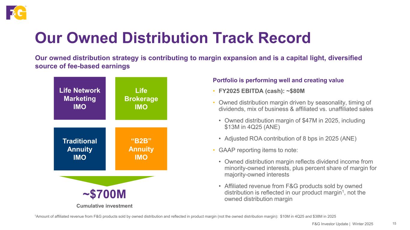 $26.4B $28.6B $37.3B $46.4B $55.9B $65.3B $73.1B 2019 2020 2021 2022 2023 2024 2025 Our Strong Sales Are Driving Record AUM … 14F&G Investor Update | Winter 2025 1CAGR reflects 2019-2025 annual periods AUM and Annual Gross Sales by Retail Channel and Institutional Market ($B) Funding Agreements Agent PRT Broker Dealer Bank $11.3B $9.6B $4.5B $3.9B FNF and F&G Merger (June 2020) $13.2B $15.3B $14.6B AUM before flow reinsurance +19% CAGR1 Gross Sales +25% CAGR1