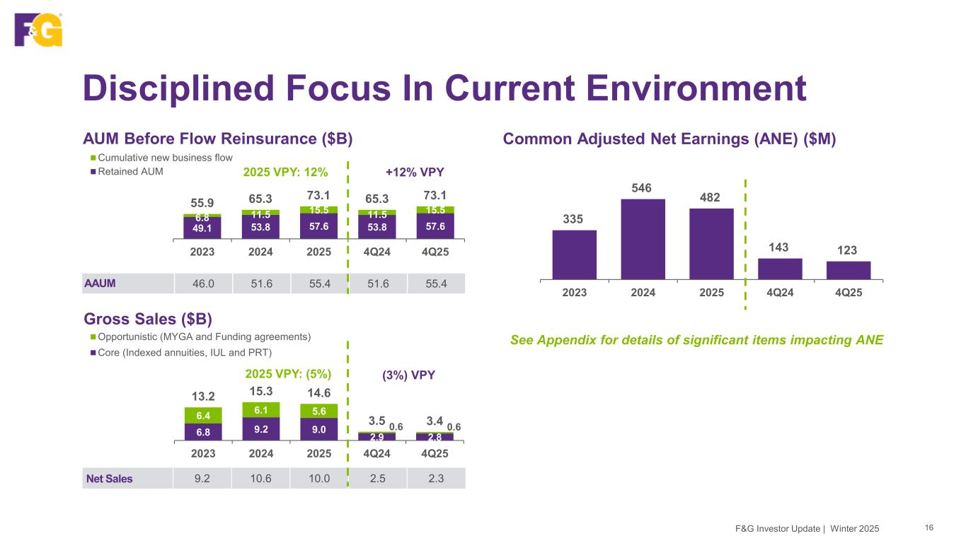 Our Owned Distribution Track Record 15F&G Investor Update | Winter 2025 Our owned distribution strategy is contributing to margin expansion and is a capital light, diversified source of fee-based earnings Portfolio is performing well and creating value • FY2025 EBITDA (cash): ~$80M • Owned distribution margin driven by seasonality, timing of dividends, mix of business & affiliated vs. unaffiliated sales • Owned distribution margin of $47M in 2025, including $13M in 4Q25 (ANE) • Adjusted ROA contribution of 8 bps in 2025 (ANE) • GAAP reporting items to note: • Owned distribution margin reflects dividend income from minority-owned interests, plus percent share of margin for majority-owned interests • Affiliated revenue from F&G products sold by owned distribution is reflected in our product margin1, not the owned distribution margin Life Network Marketing IMO Traditional Annuity IMO “B2B” Annuity IMO Life Brokerage IMO ~$700M Cumulative investment 1Amount of affiliated revenue from F&G products sold by owned distribution and reflected in product margin (not the owned distribution margin): $10M in 4Q25 and $38M in 2025
