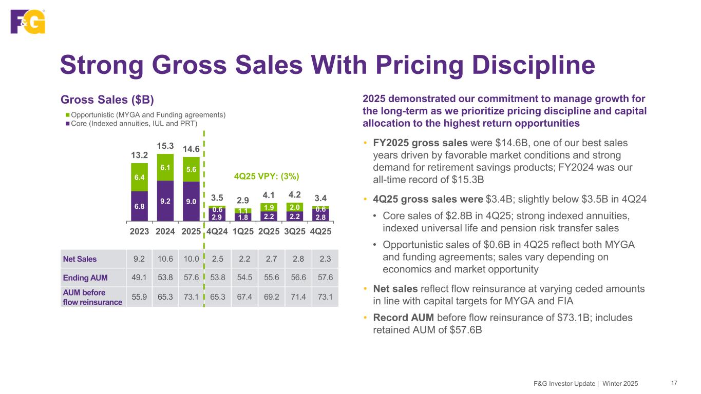 49.1 53.8 57.6 53.8 57.6 6.8 11.5 15.5 11.5 15.5 55.9 65.3 73.1 65.3 73.1 2023 2024 2025 4Q24 4Q25 Cumulative new business flow Retained AUM 6.8 9.2 9.0 2.9 2.8 6.4 6.1 5.6 0.6 0.6 13.2 15.3 14.6 3.5 3.4 2023 2024 2025 4Q24 4Q25 Opportunistic (MYGA and Funding agreements) Core (Indexed annuities, IUL and PRT) 335 546 482 143 123 2023 2024 2025 4Q24 4Q25 Net Sales 9.2 10.6 10.0 2.5 2.3 Disciplined Focus In Current Environment Gross Sales ($B) AUM Before Flow Reinsurance ($B) Common Adjusted Net Earnings (ANE) ($M) F&G Investor Update | Winter 2025 16 2025 VPY: 12% AAUM 46.0 51.6 55.4 51.6 55.4 (3%) VPY2025 VPY: (5%) +12% VPY See Appendix for details of significant items impacting ANE