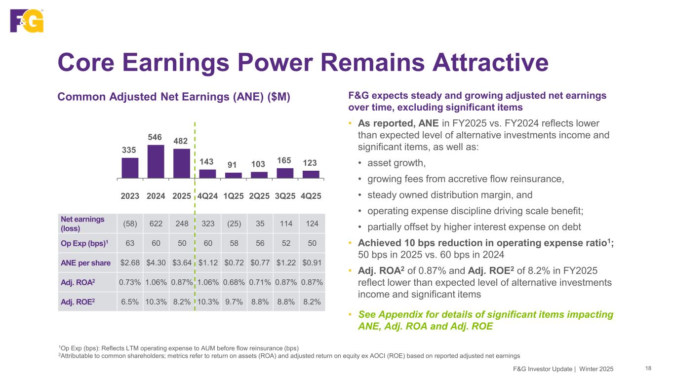 Strong Gross Sales With Pricing Discipline Gross Sales ($B) 2025 demonstrated our commitment to manage growth for the long-term as we prioritize pricing discipline and capital allocation to the highest return opportunities • FY2025 gross sales were $14.6B, one of our best sales years driven by favorable market conditions and strong demand for retirement savings products; FY2024 was our all-time record of $15.3B • 4Q25 gross sales were $3.4B; slightly below $3.5B in 4Q24 • Core sales of $2.8B in 4Q25; strong indexed annuities, indexed universal life and pension risk transfer sales • Opportunistic sales of $0.6B in 4Q25 reflect both MYGA and funding agreements; sales vary depending on economics and market opportunity • Net sales reflect flow reinsurance at varying ceded amounts in line with capital targets for MYGA and FIA • Record AUM before flow reinsurance of $73.1B; includes retained AUM of $57.6B F&G Investor Update | Winter 2025 17 Net Sales 9.2 10.6 10.0 2.5 2.2 2.7 2.8 2.3 Ending AUM 49.1 53.8 57.6 53.8 54.5 55.6 56.6 57.6 AUM before flow reinsurance 55.9 65.3 73.1 65.3 67.4 69.2 71.4 73.1 6.8 9.2 9.0 2.9 1.8 2.2 2.2 2.8 6.4 6.1 5.6 0.6 1.1 1.9 2.0 0.6 13.2 15.3 14.6 3.5 2.9 4.1 4.2 3.4 2023 2024 2025 4Q24 1Q25 2Q25 3Q25 4Q25 Opportunistic (MYGA and Funding agreements) Core (Indexed annuities, IUL and PRT) 4Q25 VPY: (3%)