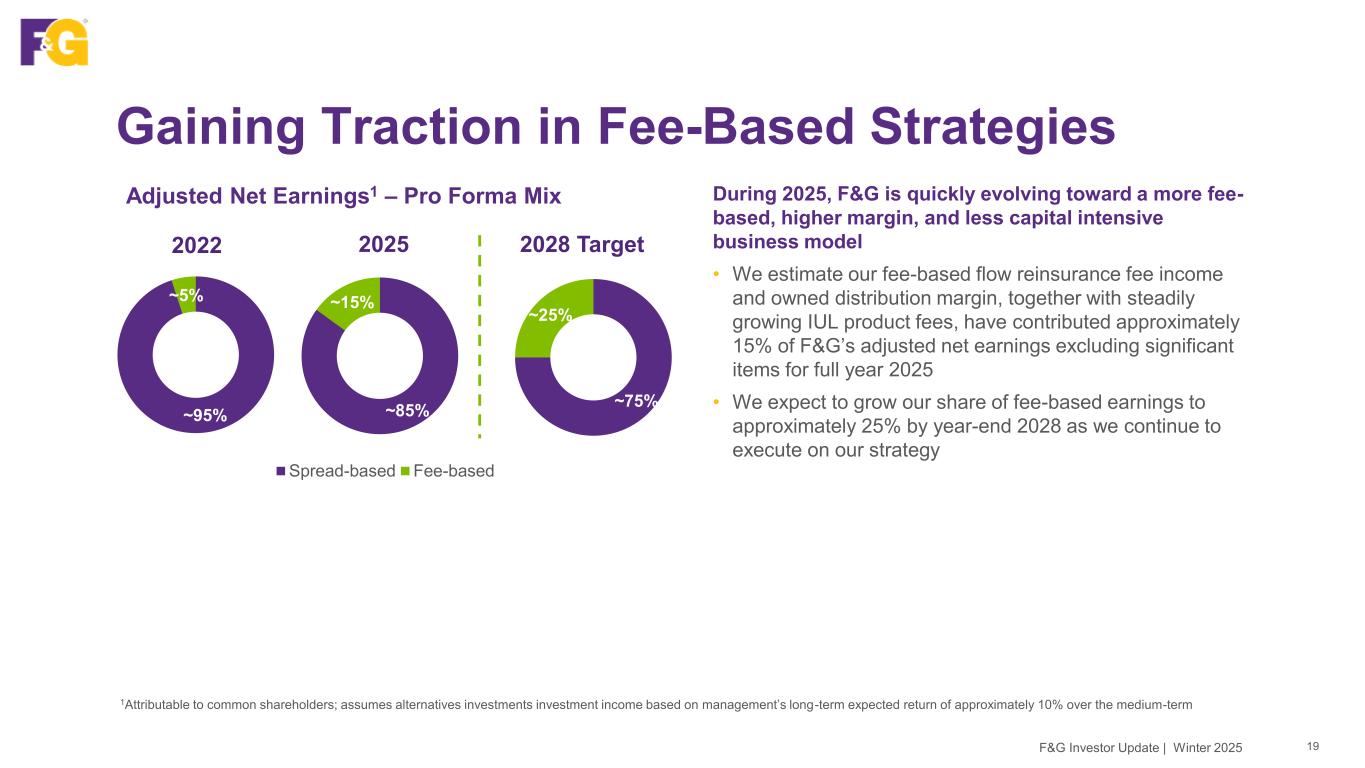 335 546 482 143 91 103 165 123 2023 2024 2025 4Q24 1Q25 2Q25 3Q25 4Q25 Net earnings (loss) (58) 622 248 323 (25) 35 114 124 Op Exp (bps)1 63 60 50 60 58 56 52 50 ANE per share $2.68 $4.30 $3.64 $1.12 $0.72 $0.77 $1.22 $0.91 Adj. ROA2 0.73% 1.06% 0.87% 1.06% 0.68% 0.71% 0.87% 0.87% Adj. ROE2 6.5% 10.3% 8.2% 10.3% 9.7% 8.8% 8.8% 8.2% Core Earnings Power Remains Attractive 18F&G Investor Update | Winter 2025 Common Adjusted Net Earnings (ANE) ($M) 1Op Exp (bps): Reflects LTM operating expense to AUM before flow reinsurance (bps) 2Attributable to common shareholders; metrics refer to return on assets (ROA) and adjusted return on equity ex AOCI (ROE) based on reported adjusted net earnings F&G expects steady and growing adjusted net earnings over time, excluding significant items • As reported, ANE in FY2025 vs. FY2024 reflects lower than expected level of alternative investments income and significant items, as well as: • asset growth, • growing fees from accretive flow reinsurance, • steady owned distribution margin, and • operating expense discipline driving scale benefit; • partially offset by higher interest expense on debt • Achieved 10 bps reduction in operating expense ratio1; 50 bps in 2025 vs. 60 bps in 2024 • Adj. ROA2 of 0.87% and Adj. ROE2 of 8.2% in FY2025 reflect lower than expected level of alternative investments income and significant items • See Appendix for details of significant items impacting ANE, Adj. ROA and Adj. ROE