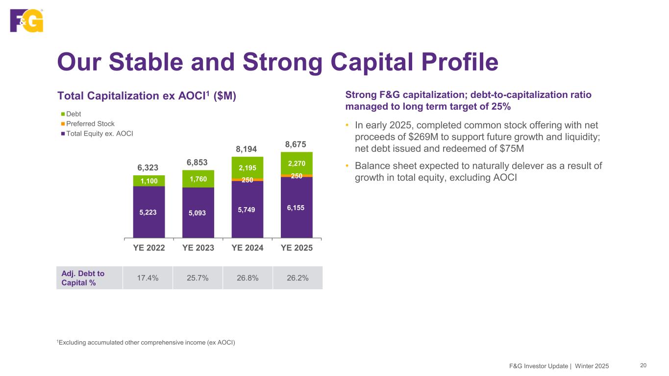 Gaining Traction in Fee-Based Strategies 19F&G Investor Update | Winter 2025 2025 2028 Target ~85% ~15% Spread-based Fee-based ~75% ~25% During 2025, F&G is quickly evolving toward a more fee- based, higher margin, and less capital intensive business model • We estimate our fee-based flow reinsurance fee income and owned distribution margin, together with steadily growing IUL product fees, have contributed approximately 15% of F&G’s adjusted net earnings excluding significant items for full year 2025 • We expect to grow our share of fee-based earnings to approximately 25% by year-end 2028 as we continue to execute on our strategy ~95% ~5% 2022 Adjusted Net Earnings1 – Pro Forma Mix 1Attributable to common shareholders; assumes alternatives investments investment income based on management’s long-term expected return of approximately 10% over the medium-term